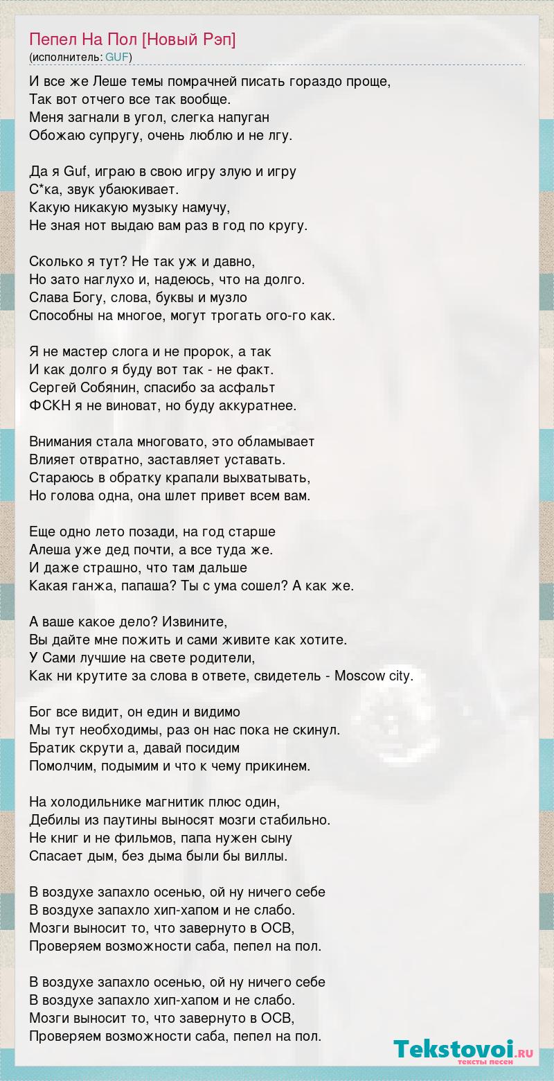 И все же Леше темы помрачней писать гораздо проще, Так вот отчего все так вообще. Меня загнали в угол, слегка напуган Обожаю супругу, очень люблю и не лгу. Да я Guf, играю в свою игру злую и игру С*ка, звук убаюкивает. Какую никакую музыку намучу, Не зная нот выдаю вам раз в год по кругу. Сколько я тут? Не так уж и давно, Но зато наглухо и, надеюсь, что на долго. Слава Богу, слова, буквы и музло Способны на многое, могут трогать ого-го как. Я не мастер слога и не пророк, а так И как долго я буду вот так - не факт. Сергей Собянин, спасибо за асфальт ФСКН я не виноват, но буду аккуратнее. Внимания стала многовато, это обламывает Влияет отвратно, заставляет уставать. Стараюсь в обратку крапали выхватывать, Но голова одна, она шлет привет всем вам. Еще одно лето позади, на год старше Алеша уже дед почти, а все туда же. И даже страшно, что там дальше Какая ганжа, папаша? Ты с ума сошел? А как же. А ваше какое дело? Извините, Вы дайте мне пожить и сами живите как хотите. У Сами лучшие на свете родители, Как ни крутите за слова в ответе, свидетель - Moscow city. Бог все видит, он един и видимо Мы тут необходимы, раз он нас пока не скинул. Братик скрути а, давай посидим Помолчим, подымим и что к чему прикинем. На холодильнике магнитик плюс один, Дебилы из паутины выносят мозги стабильно. Не книг и не фильмов, папа нужен сыну Спасает дым, без дыма были бы виллы. В воздухе запахло осенью, ой ну ничего себе В воздухе запахло хип-хапом и не слабо. Мозги выносит то, что завернуто в ОСВ, Проверяем возможности саба, пепел на пол. В воздухе запахло осенью, ой ну ничего себе В воздухе запахло хип-хапом и не слабо. Мозги выносит то, что завернуто в ОСВ, Проверяем возможности саба, пепел на пол.