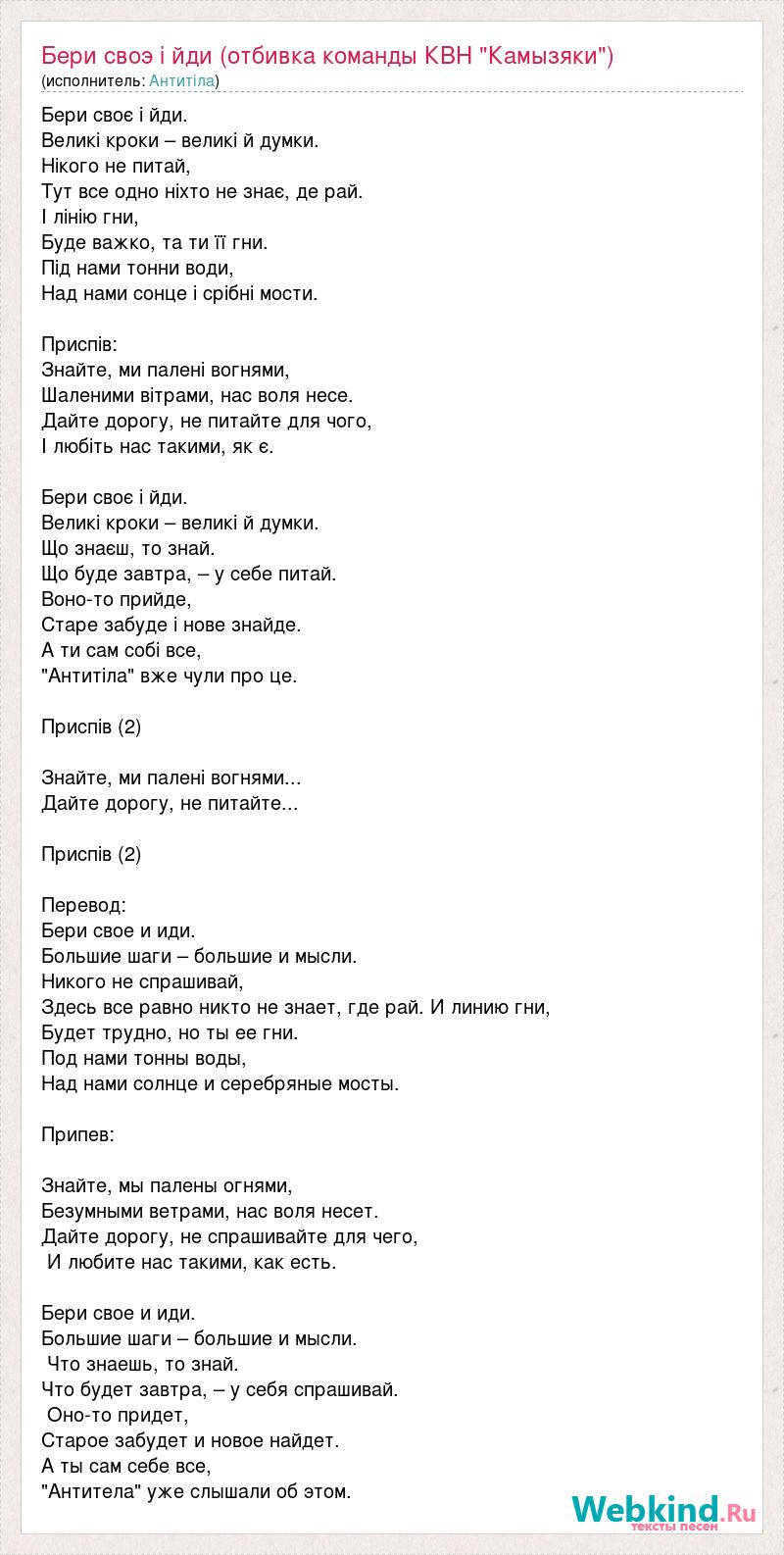 Бери своє і йди. Великі кроки – великі й думки. Нікого не питай, Тут все одно ніхто не знає, де рай. І лінію гни, Буде важко, та ти її гни. Під нами тонни води, Над нами сонце і срібні мости. Приспів: Знайте, ми палені вогнями, Шаленими вітрами, нас воля несе. Дайте дорогу, не питайте для чого, І любіть нас такими, як є. Бери своє і йди. Великі кроки – великі й думки. Що знаєш, то знай. Що буде завтра, – у себе питай. Воно-то прийде, Старе забуде і нове знайде. А ти сам собі все, "Антитіла" вже чули про це. Приспів (2) Знайте, ми палені вогнями... Дайте дорогу, не питайте... Приспів (2) Перевод: Бери свое и иди. Большие шаги – большие и мысли. Никого не спрашивай, Здесь все равно никто не знает, где рай. И линию гни, Будет трудно, но ты ее гни. Под нами тонны воды, Над нами солнце и серебряные мосты. Припев: Знайте, мы палены огнями, Безумными ветрами, нас воля несет. Дайте дорогу, не спрашивайте для чего, И любите нас такими, как есть. Бери свое и иди. Большие шаги – большие и мысли. Что знаешь, то знай. Что будет завтра, – у себя спрашивай. Оно-то придет, Старое забудет и новое найдет. А ты сам себе все, "Антитела" уже слышали об этом.