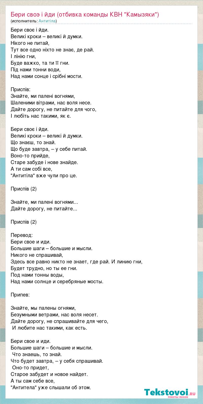 Бери своє і йди. Великі кроки – великі й думки. Нікого не питай, Тут все одно ніхто не знає, де рай. І лінію гни, Буде важко, та ти її гни. Під нами тонни води, Над нами сонце і срібні мости. Приспів: Знайте, ми палені вогнями, Шаленими вітрами, нас воля несе. Дайте дорогу, не питайте для чого, І любіть нас такими, як є. Бери своє і йди. Великі кроки – великі й думки. Що знаєш, то знай. Що буде завтра, – у себе питай. Воно-то прийде, Старе забуде і нове знайде. А ти сам собі все, "Антитіла" вже чули про це. Приспів (2) Знайте, ми палені вогнями... Дайте дорогу, не питайте... Приспів (2) Перевод: Бери свое и иди. Большие шаги – большие и мысли. Никого не спрашивай, Здесь все равно никто не знает, где рай. И линию гни, Будет трудно, но ты ее гни. Под нами тонны воды, Над нами солнце и серебряные мосты. Припев: Знайте, мы палены огнями, Безумными ветрами, нас воля несет. Дайте дорогу, не спрашивайте для чего, И любите нас такими, как есть. Бери свое и иди. Большие шаги – большие и мысли. Что знаешь, то знай. Что будет завтра, – у себя спрашивай. Оно-то придет, Старое забудет и новое найдет. А ты сам себе все, "Антитела" уже слышали об этом.