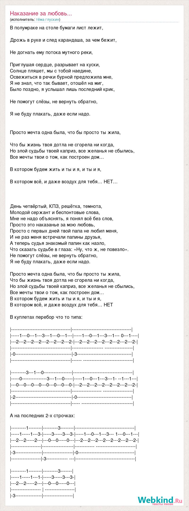 В полумраке на столе бумаги лист лежит, Дрожь в руке и след карандаша, за чем бежит, Не догнать ему потока мутного реки, Приглушая сердце, разрывает на куски, Солнце пляшет, мы с тобой наедине, Освежиться в речки бурной предложила мне, Я не знал, что так бывает, отошёл на миг, Было поздно, я услышал лишь последний крик, Не помогут слёзы, не вернуть обратно, Я не буду плакать, даже если надо. Просто мечта одна была, что бы просто ты жила, Что бы жизнь твоя дотла не сгорела ни когда, Но злой судьбы твоей каприз, все желанья не сбылись, Все мечты твои о том, как построен дом… В котором будем жить и ты и я, и ты и я, В котором всё, и даже воздух для тебя… НЕТ… День четвёртый, КПЗ, решётка, темнота, Молодой сержант и беспонтовые слова, Мне не надо объяснять, я понял всё без слов, Просто это наказанье за мою любовь, Просто с первых дней твой папа не любил меня, И не раз меня встречали папины друзья, А теперь судья знакомый папин как назло, Что сказать судьбе в глаза: «Ну, что ж, не повезло». Не помогут слёзы, не вернуть обратно, Я не буду плакать, даже если надо. Просто мечта одна была, что бы просто ты жила, Что бы жизнь твоя дотла не сгорела ни когда, Но злой судьбы твоей каприз, все желанья не сбылись, Все мечты твои о том, как построен дом… В котором будем жить и ты и я, и ты и я, В котором всё, и даже воздух для тебя… НЕТ В куплетах перебор что то типа: |------------------------------------|------------------------------------| |-----1---0---1---3---1---0---1---|-----1---0---1---3---1--- 0---1----| |---2---2---2---2---2---2---2---2-|---2---2---2---2---2---2---2---2-| |------------------------------------|------------------- -----------------| |-0----------------------------------|-3---------------------------------| |------------------------------------|------ ------------------------------| |---------3---1---0-----------------|------------------------------------| |-----0---------------3---1---0-----|-----1---0---1---3---1- --1---1---| |---0---0---0---0---0---0---0---0-|---2---2---2---2---2---2---2---2-| |------------------------------------|------------------ ------------------| |-2----------------------------------|-0---------------------------------| |------------------------------------|----- -------------------------------| А на последних 2-х строчках: |---------1--------|---------3--------|------------------------------------| |-----1-----1---3-|-----3-----3---3-|-----1---0---1---3--- 1---0---1---| |---2---2-----2---|---0---0-----0---|---2---2---2---2---2---2---2---2-| |------------------|-------------------|------------ ------------------------| |-3----------------|------------------|-0----------------------------------| |------------------|-3------------- ---|------------------------------------| |---------1--------|---------3-------| |-----1-----1---1-|-----3-----3---3-| |---2---2-----2---|---0---0-----0---| |------------------ | ------------------| |-3----------------|------------------|