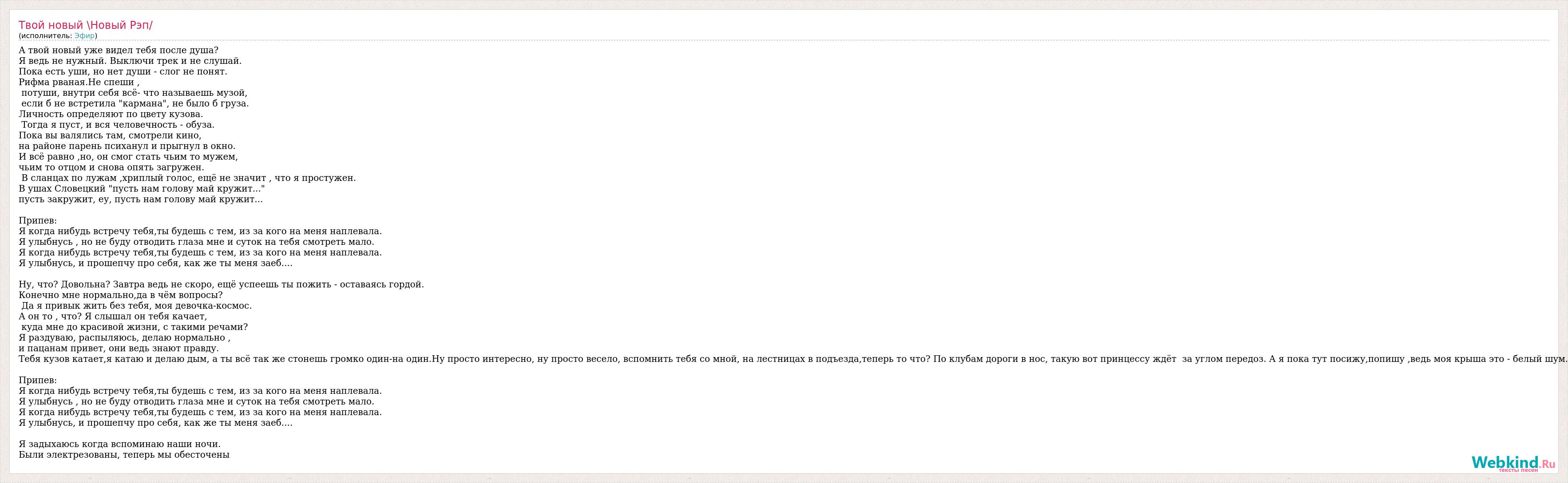 А твой новый уже видел тебя после душа? Я ведь не нужный. Выключи трек и не слушай. Пока есть уши, но нет души - слог не понят. Рифма рваная.Не спеши , потуши, внутри себя всё- что называешь музой, если б не встретила "кармана", не было б груза. Личность определяют по цвету кузова. Тогда я пуст, и вся человечность - обуза. Пока вы валялись там, смотрели кино, на районе парень психанул и прыгнул в окно. И всё равно ,но, он смог стать чьим то мужем, чьим то отцом и снова опять загружен. В сланцах по лужам ,хриплый голос, ещё не значит , что я простужен. В ушах Словецкий "пусть нам голову май кружит..." пусть закружит, еу, пусть нам голову май кружит... Припев: Я когда нибудь встречу тебя,ты будешь с тем, из за кого на меня наплевала. Я улыбнусь , но не буду отводить глаза мне и суток на тебя смотреть мало. Я когда нибудь встречу тебя,ты будешь с тем, из за кого на меня наплевала. Я улыбнусь, и прошепчу про себя, как же ты меня заеб.... Ну, что? Довольна? Завтра ведь не скоро, ещё успеешь ты пожить - оставаясь гордой. Конечно мне нормально,да в чём вопросы? Да я привык жить без тебя, моя девочка-космос. А он то , что? Я слышал он тебя качает, куда мне до красивой жизни, с такими речами? Я раздуваю, распыляюсь, делаю нормально , и пацанам привет, они ведь знают правду. Тебя кузов катает,я катаю и делаю дым, а ты всё так же стонешь громко один-на один.Ну просто интересно, ну просто весело, вспомнить тебя со мной, на лестницах в подъезда,теперь то что? По клубам дороги в нос, такую вот принцессу ждёт за углом передоз. А я пока тут посижу,попишу ,ведь моя крыша это - белый шум. Припев: Я когда нибудь встречу тебя,ты будешь с тем, из за кого на меня наплевала. Я улыбнусь , но не буду отводить глаза мне и суток на тебя смотреть мало. Я когда нибудь встречу тебя,ты будешь с тем, из за кого на меня наплевала. Я улыбнусь, и прошепчу про себя, как же ты меня заеб.... Я задыхаюсь когда вспоминаю наши ночи. Были электрезованы, теперь мы обесточены