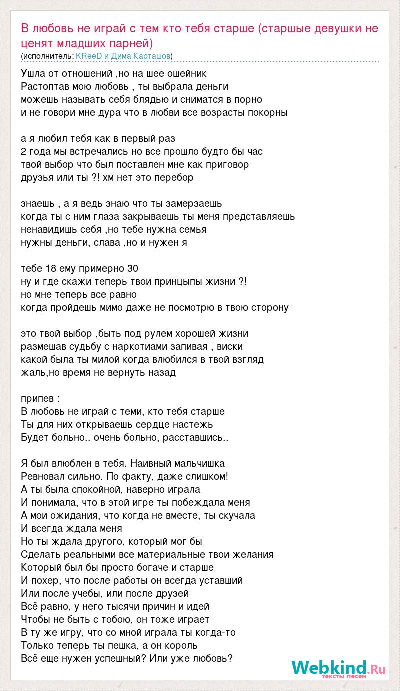 Ушла от отношений ,но на шее ошейник Растоптав мою любовь , ты выбрала деньги можешь называть себя блядью и сниматся в порно и не говори мне дура что в любви все возрасты покорны а я любил тебя как в первый раз 2 года мы встречались но все прошло будто бы час твой выбор что был поставлен мне как приговор друзья или ты ?! хм нет это перебор знаешь , а я ведь знаю что ты замерзаешь когда ты с ним глаза закрываешь ты меня представляешь ненавидишь себя ,но тебе нужна семья нужны деньги, слава ,но и нужен я тебе 18 ему примерно 30 ну и где скажи теперь твои принцыпы жизни ?! но мне теперь все равно когда пройдешь мимо даже не посмотрю в твою сторону это твой выбор ,быть под рулем хорошей жизни размешав судьбу с наркотиами запивая , виски какой была ты милой когда влюбился в твой взгляд жаль,но время не вернуть назад припев : В любовь не играй с теми, кто тебя старше Ты для них открываешь сердце настежь Будет больно.. очень больно, расставшись.. Я был влюблен в тебя. Наивный мальчишка Ревновал сильно. По факту, даже слишком! А ты была спокойной, наверно играла И понимала, что в этой игре ты побеждала меня А мои ожидания, что когда не вместе, ты скучала И всегда ждала меня Но ты ждала другого, который мог бы Сделать реальными все материальные твои желания Который был бы просто богаче и старше И похер, что после работы он всегда уставший Или после учебы, или после друзей Всё равно, у него тысячи причин и идей Чтобы не быть с тобою, он тоже играет В ту же игру, что со мной играла ты когда-то Только теперь ты пешка, а он король Всё еще нужен успешный? Или уже любовь?