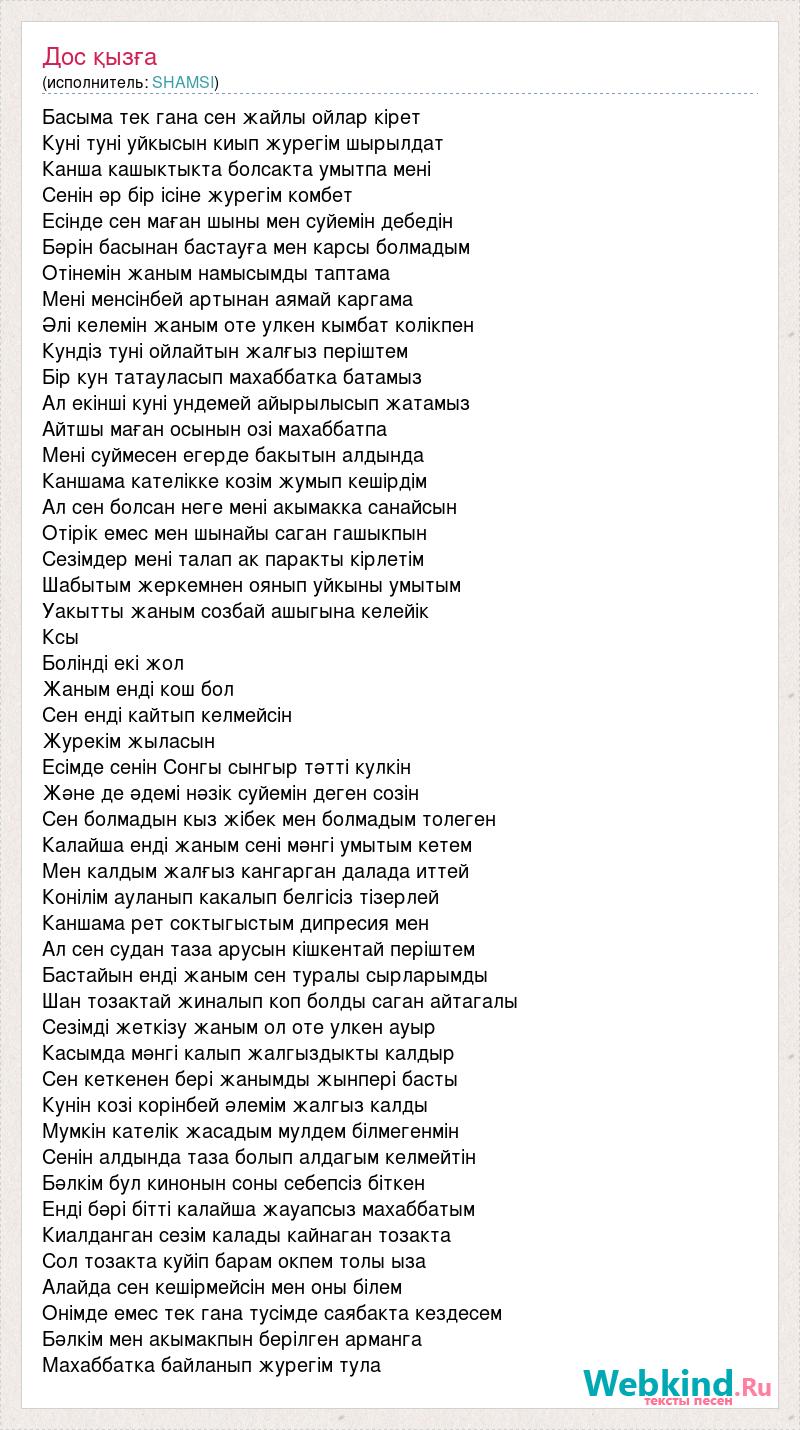 Басыма тек гана сен жайлы ойлар кірет Куні туні уйкысын киып журегім шырылдат Канша кашыктыкта болсакта умытпа мені Сенін әр бір ісіне журегім комбет Есінде сен маған шыны мен суйемін дебедін Бәрін басынан бастауға мен карсы болмадым Отінемін жаным намысымды таптама Мені менсінбей артынан аямай каргама Әлі келемін жаным оте улкен кымбат колікпен Кундіз туні ойлайтын жалғыз періштем Бір кун татауласып махаббатка батамыз Ал екінші куні ундемей айырылысып жатамыз Айтшы маған осынын озі махаббатпа Мені суймесен егерде бакытын алдында Каншама кателікке козім жумып кешірдім Ал сен болсан неге мені акымакка санайсын Отірік емес мен шынайы саган гашыкпын Сезімдер мені талап ак паракты кірлетім Шабытым жеркемнен оянып уйкыны умытым Уакытты жаным созбай ашыгына келейік Ксы Болінді екі жол Жаным енді кош бол Сен енді кайтып келмейсін Журекім жыласын Есімде сенін Сонгы сынгыр тәтті кулкін Және де әдемі нәзік суйемін деген созін Сен болмадын кыз жібек мен болмадым толеген Калайша енді жаным сені мәнгі умытым кетем Мен калдым жалғыз кангарган далада иттей Конілім ауланып какалып белгісіз тізерлей Каншама рет соктыгыстым дипресия мен Ал сен судан таза арусын кішкентай періштем Бастайын енді жаным сен туралы сырларымды Шан тозактай жиналып коп болды саган айтагалы Сезімді жеткізу жаным ол оте улкен ауыр Касымда мәнгі калып жалгыздыкты калдыр Сен кеткенен бері жанымды жынпері басты Кунін козі корінбей әлемім жалгыз калды Мумкін кателік жасадым мулдем білмегенмін Сенін алдында таза болып алдагым келмейтін Бәлкім бул кинонын соны себепсіз біткен Енді бәрі бітті калайша жауапсыз махаббатым Киалданган сезім калады кайнаган тозакта Сол тозакта куйіп барам окпем толы ыза Алайда сен кешірмейсін мен оны білем Онімде емес тек гана тусімде саябакта кездесем Бәлкім мен акымакпын берілген арманга Махаббатка байланып журегім тула