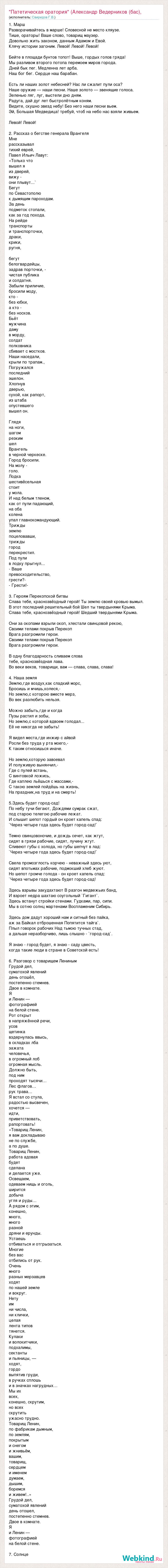 1. Марш Разворачивайтесь в марше! Словесной не место кляузе. Тише, ораторы! Ваше слово, товарищ маузер. Довольно жить законом, данным Адамом и Евой. Клячу истории загоним. Левой! Левой! Левой! Бейте в площади бунтов топот! Выше, гордых голов гряда! Мы разливом второго потопа перемоем миров города. Дней бык пег. Медленна лет арба. Наш бог бег. Сердце наш барабан. Есть ли наших золот небесней? Нас ли сжалит пули оса? Наше оружие — наши песни. Наше золото — звенящие голоса. Зеленью ляг, луг, выстели дно дням. Радуга, дай дуг лет быстролётным коням. Видите, скушно звезд небу! Без него наши песни вьем. Эй, Большая Медведица! требуй, чтоб на небо нас взяли живьем. Левой! Левой! 2. Рассказ о бегстве генерала Врангеля Мне рассказывал тихий еврей, Павел Ильич Лавут: «Только что вышел я из дверей, вижу - они плывут...` Бегут по Севастополю к дымящим пароходам. За день подметок стопали, как за год похода. На рейде транспорты и транспорточки, драки, крики, ругня, бегут белогвардейцы, задрав порточки, - чистая публика и солдатня. Забыли приличие, бросили моду, кто - без юбки, а кто - без носков. Бьёт мужчина даму в морду, солдат полковника сбивает с мостков. Наши наседали, крыли по трапам., Погружался последний эшелон. Хлопнув дверью, сухой, как рапорт, из штаба опустевшего вышел он. Глядя на ноги, шагом резким шел Врангель в черной черкеске. Город бросили. На молу - голо. Лодка шестивёсельная стоит у мола. И над белым тленом, как от пули падающий, на оба колена упал главнокомандующий. Трижды землю поцеловавши, трижды город перекрестил. Под пули в лодку прыгнул... - Ваше превосходительство, грести?- - Грести!- 3. Героям Перекопской битвы Слава тебе, краснозвёздный герой! Ты землю своей кровью вымыл. В этот последний решительный бой Шел ты твердынями Крыма. Слава тебе, краснозвёздный герой! Шедший твердынями Крыма. Они за окопами взрыли окоп, хлестали свинцовой рекою, Своими телами покрыв Перекоп Врага разгромили герои. Своими телами покрыв Перекоп Врага разгромили герои. В одну благодарность сливаем слова тебе, краснозвёздная лава. Во веки веков, товарищи, вам — слава, слава, слава! 4. Наша земля Землю,где воздух,как сладкий морс, Бросишь и мчишь,колеся,- Но землю,с которою вместе мерз, Во век разлюбить нельзя. Можно забыть,где и когда Пузы растил и зобы, Но землю,с которой вдвоем голодал... Её не никогда не забыть! Я видел места,где инжир с айвой Росли без труда у рта моего,- К таким относишься иначе. Но землю,которую завоевал И полуживую вынянчил,- Где с пулей встань, С винтовкой ложись, Где каплею льёшься с массами,- С такою землей пойдёшь на жизнь, На праздник,на труд и на смерть! 5.Здесь будет город-сад! По небу тучи бегают, Дождями сумрак сжат, под старою телегою рабочие лежат. И слышит шепот гордый он кроет капель спад: `Через четыре года здесь будет город-сад!` Темно свинцовоночие, и дождь сечет, как жгут, сидят в грязи рабочие, сидят, лучину жгут. Сливеют губы с холода, но губы шепчут в лад: `Через четыре года здесь будет город-сад!` Свела промозглость корчею - неважный здесь уют, сидят впотьмах рабочие, подмокший хлеб жуют. Но шепот громче голода - он кроет капель спад: `Через четыре года здесь будет город-сад! Здесь взрывы закудахтают В разгон медвежьих банд, И взроет недра шахтаю соугольный `Гигант`. Здесь встанут стройки стенами. Гудками, пар, сипи. Мы в сотню солнц мартенами Воспламеним Сиби