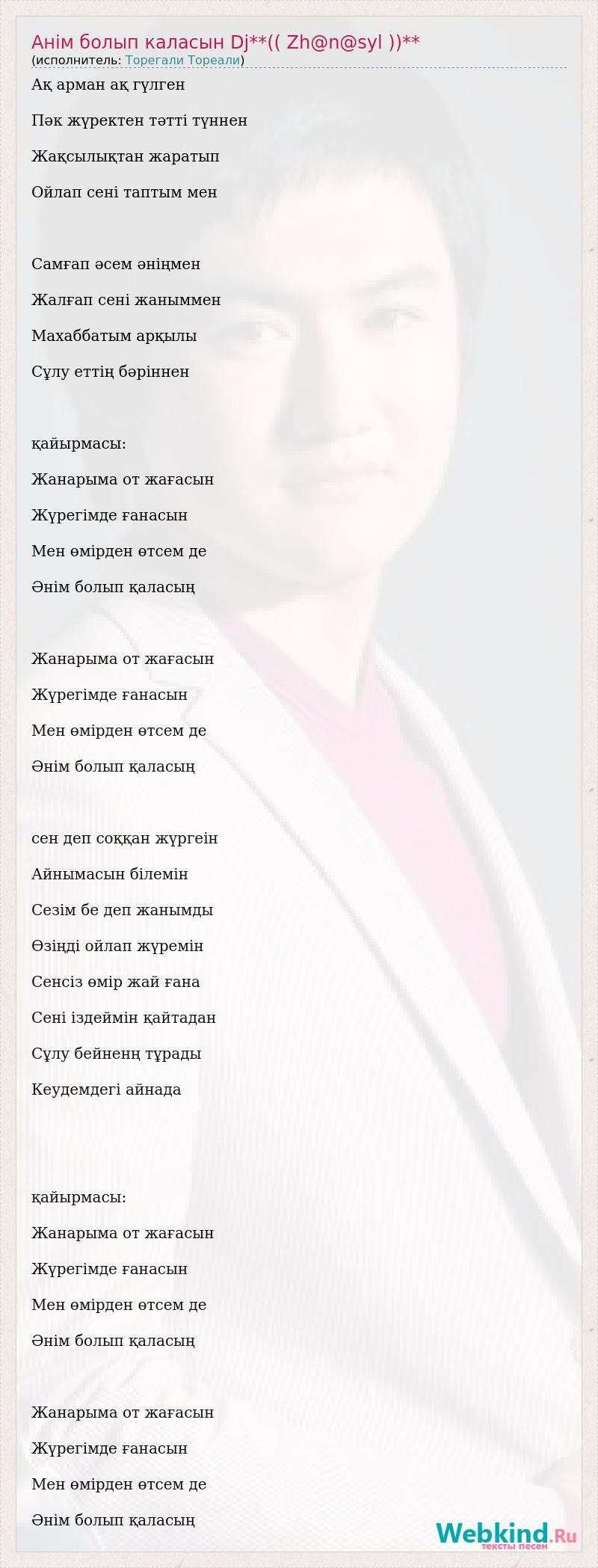 Ақ арман ақ гүлген Пәк жүректен тәтті түннен Жақсылықтан жаратып Ойлап сені таптым мен Самғап әсем әніңмен Жалғап сені жаныммен Махаббатым арқылы Сұлу еттің бәріннен қайырмасы: Жанарыма от жағасын Жүрегімде ғанасын Мен өмірден өтсем де Әнім болып қаласың Жанарыма от жағасын Жүрегімде ғанасын Мен өмірден өтсем де Әнім болып қаласың сен деп соққан жүргеін Айнымасын білемін Сезім бе деп жанымды Өзіңді ойлап жүремін Сенсіз өмір жай ғана Сені іздеймін қайтадан Сұлу бейненң тұрады Кеудемдегі айнада қайырмасы: Жанарыма от жағасын Жүрегімде ғанасын Мен өмірден өтсем де Әнім болып қаласың Жанарыма от жағасын Жүрегімде ғанасын Мен өмірден өтсем де Әнім болып қаласың