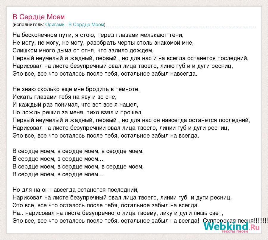 На бесконечном пути, я стою, перед глазами мелькают тени, Не могу, не могу, не могу, разобрать черты столь знакомой мне, Слишком много дыма от огня, что залило дождем, Первый неумелый и жадный, первый , но для нас и на всегда останется последний, Нарисовал на листе безупречный овал лица твоего, линю губ и и дуги ресниц, Это все, все что осталось после тебя, остальное забыл навсегда. Не знаю сколько еще мне бродить в темноте, Искать глазами тебя на яву и во сне, И каждый раз понимая, что вот все я нашел, Но дождь решил за меня, тихо взял и прошел, Первый неумелый и жадный, первый , но для нас он навсегда останется последний, Нарисовал на листе безупречнйи овал лица твоего, линии губ и дуги ресниц, Это все, все что осталось после тебя, остальное забыл на всегда. В сердце моем, в сердце моем, в сердце моем, В сердце моем, в сердце моем... В сердце моем, в сердце моем, в сердце моем, В сердце моем, в сердце моем... Но для на он навсегда останется последний, Нарисовал на листе безупречный овал лица твоего, линии губ и дуги ресниц, Это все, все что осталось после тебя, остальное забыл на всегда. На.. нарисовал на листе безупречного лица твоему, лику и дуги лишь свет, Это все, все что осталось после тебя, остальное забыл на всегда! Супперская песня!!!!!!!!