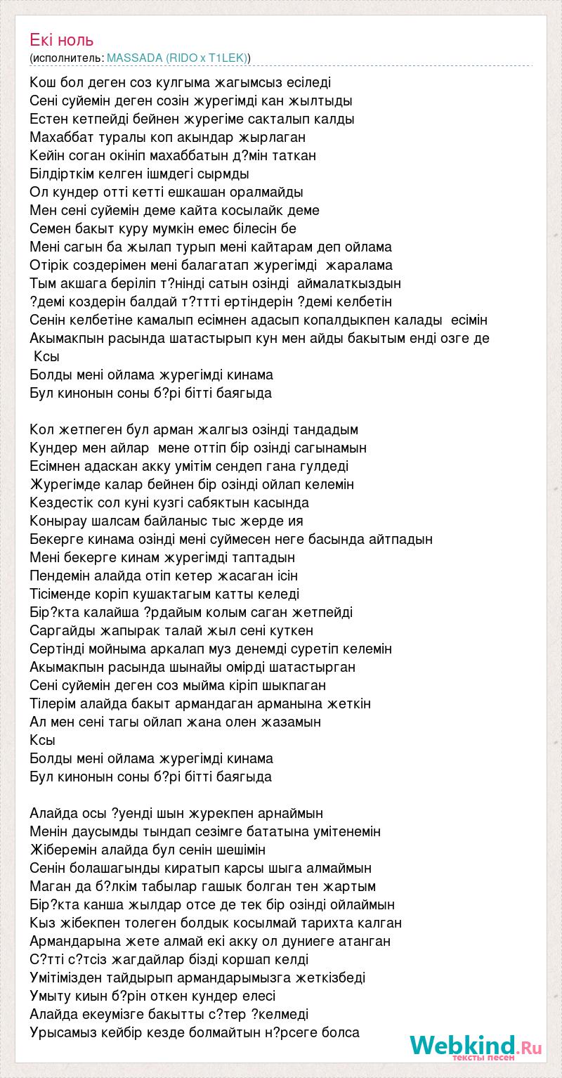 Кош бол деген соз кулгыма жагымсыз есіледі Сені суйемін деген созін журегімді кан жылтыды Естен кетпейді бейнен журегіме сакталып калды Махаббат туралы коп акындар жырлаган Кейін соган окініп махаббатын д?мін таткан Білдірткім келген ішмдегі сырмды Ол кундер отті кетті ешкашан оралмайды Мен сені суйемін деме кайта косылайк деме Семен бакыт куру мумкін емес білесін бе Мені сагын ба жылап турып мені кайтарам деп ойлама Отірік создерімен мені балагатап журегімді жаралама Тым акшага беріліп т?нінді сатын озінді аймалаткыздын ?демі коздерін балдай т?ттті ертіндерін ?демі келбетін Сенін келбетіне камалып есімнен адасып копалдыкпен калады есімін Акымакпын расында шатастырып кун мен айды бакытым енді озге де Ксы Болды мені ойлама журегімді кинама Бул кинонын соны б?рі бітті баягыда Кол жетпеген бул арман жалгыз озінді тандадым Кундер мен айлар мене оттіп бір озінді сагынамын Есімнен адаскан акку умітім сендеп гана гулдеді Журегімде калар бейнен бір озінді ойлап келемін Кездестік сол куні кузгі сабяктын касында Конырау шалсам байланыс тыс жерде ия Бекерге кинама озінді мені суймесен неге басында айтпадын Мені бекерге кинам журегімді таптадын Пендемін алайда отіп кетер жасаган ісін Тісіменде коріп кушактагым катты келеді Бір?кта калайша ?рдайым колым саган жетпейді Саргайды жапырак талай жыл сені куткен Сертінді мойныма аркалап муз денемді суретіп келемін Акымакпын расында шынайы омірді шатастырган Сені суйемін деген соз мыйма кіріп шыкпаган Тілерім алайда бакыт армандаган арманына жеткін Ал мен сені тагы ойлап жана олен жазамын Ксы Болды мені ойлама журегімді кинама Бул кинонын соны б?рі бітті баягыда Алайда осы ?уенді шын журекпен арнаймын Менін даусымды тындап сезімге бататына умітенемін Жіберемін алайда бул сенін шешімін Сенін болашагынды киратып карсы шыга алмаймын Маган да б?лкім табылар гашык болган тен жартым Бір?кта канша жылдар отсе де тек бір озінді ойлаймын Кыз жібекпен толеген болдык косылмай тарихта калган Армандарына жете алмай екі акку ол дуниеге атанган С?тті с?тсіз жагдайлар бізді коршап келді Умітімізден тайдырып армандарымызга жеткізбеді Умыту киын б?рін откен кундер елесі Алайда екеумізге бакытты с?тер ?келмеді Урысамыз кейбір кезде болмайтын н?рсеге болса