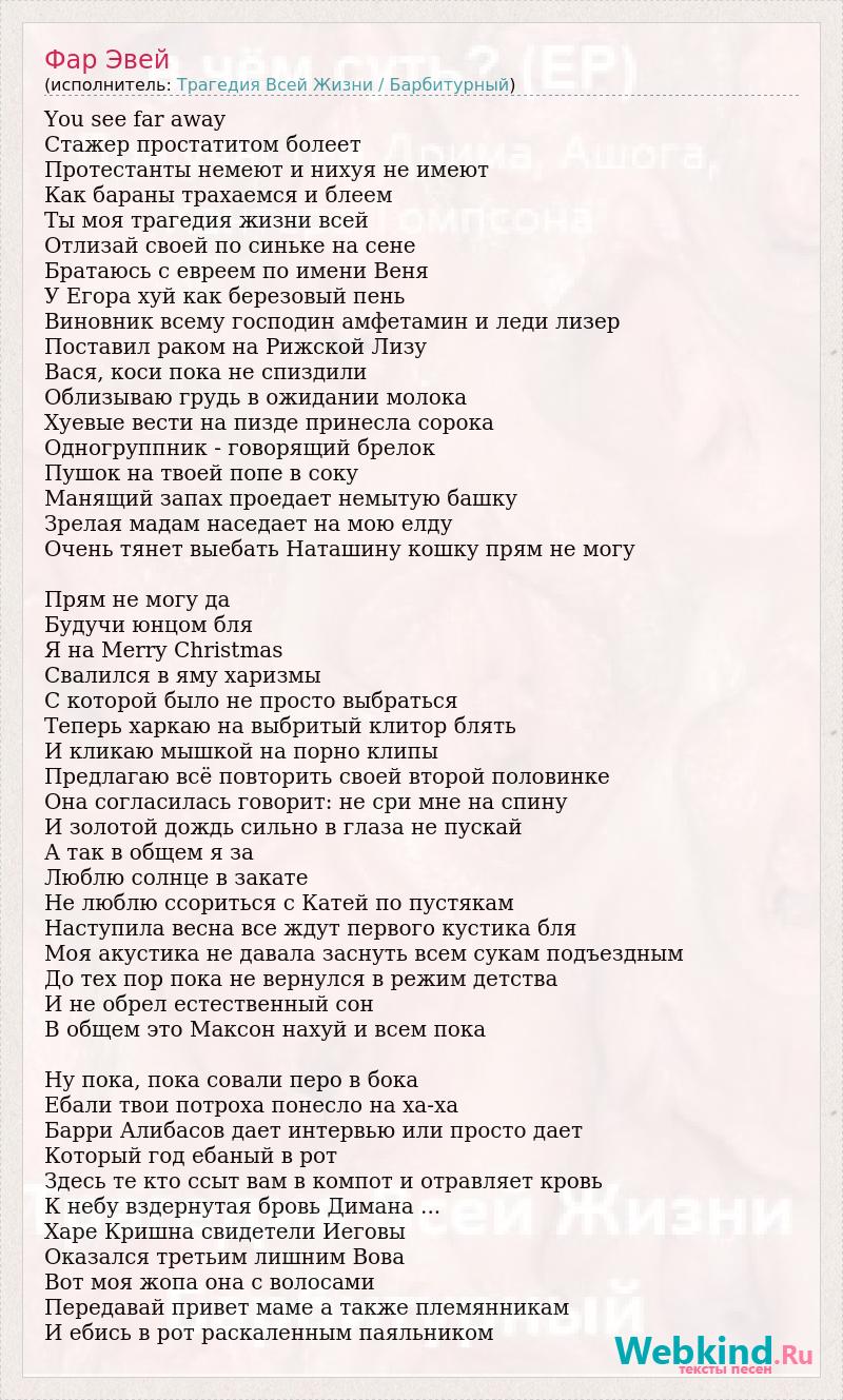 You see far away Стажер простатитом болеет Протестанты немеют и нихуя не имеют Как бараны трахаемся и блеем Ты моя трагедия жизни всей Отлизай своей по синьке на сене Братаюсь с евреем по имени Веня У Егора хуй как березовый пень Виновник всему господин амфетамин и леди лизер Поставил раком на Рижской Лизу Вася, коси пока не спиздили Облизываю грудь в ожидании молока Хуевые вести на пизде принесла сорока Одногруппник - говорящий брелок Пушок на твоей попе в соку Манящий запах проедает немытую башку Зрелая мадам наседает на мою елду Очень тянет выебать Наташину кошку прям не могу Прям не могу да Будучи юнцом бля Я на Merry Christmas Свалился в яму харизмы С которой было не просто выбраться Теперь харкаю на выбритый клитор блять И кликаю мышкой на порно клипы Предлагаю всё повторить своей второй половинке Она согласилась говорит: не сри мне на спину И золотой дождь сильно в глаза не пускай А так в общем я за Люблю солнце в закате Не люблю ссориться с Катей по пустякам Наступила весна все ждут первого кустика бля Моя акустика не давала заснуть всем сукам подъездным До тех пор пока не вернулся в режим детства И не обрел естественный сон В общем это Максон нахуй и всем пока Ну пока, пока совали перо в бока Ебали твои потроха понесло на ха-ха Барри Алибасов дает интервью или просто дает Который год ебаный в рот Здесь те кто ссыт вам в компот и отравляет кровь К небу вздернутая бровь Димана ... Харе Кришна свидетели Иеговы Оказался третьим лишним Вова Вот моя жопа она с волосами Передавай привет маме а также племянникам И ебись в рот раскаленным паяльником