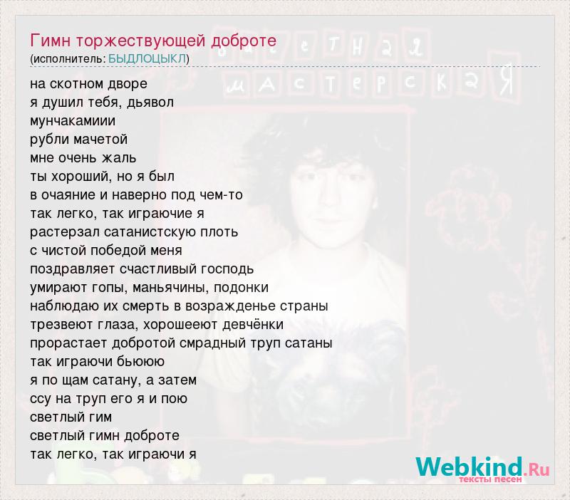 на скотном дворе я душил тебя, дьявол мунчакамиии рубли мачетой мне очень жаль ты хороший, но я был в очаяние и наверно под чем-то так легко, так играючие я растерзал сатанистскую плоть с чистой победой меня поздравляет счастливый господь умирают гопы, маньячины, подонки наблюдаю их смерть в возражденье страны трезвеют глаза, хорошееют девчёнки прорастает добротой смрадный труп сатаны так играючи бьююю я по щам сатану, а затем ссу на труп его я и пою светлый гим светлый гимн доброте так легко, так играючи я