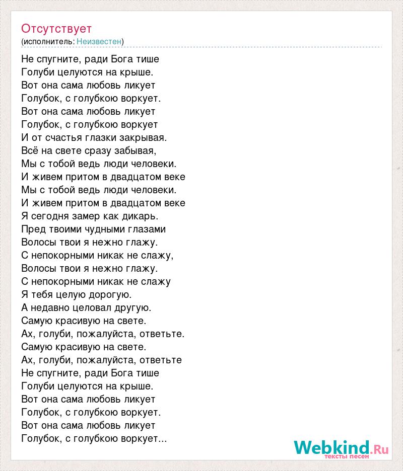 Не спугните, ради Бога тише Голуби целуются на крыше. Вот она сама любовь ликует Голубок, с голубкою воркует. Вот она сама любовь ликует Голубок, с голубкою воркует И от счастья глазки закрывая. Всё на свете сразу забывая, Мы с тобой ведь люди человеки. И живем притом в двадцатом веке Мы с тобой ведь люди человеки. И живем притом в двадцатом веке Я сегодня замер как дикарь. Пред твоими чудными глазами Волосы твои я нежно глажу. С непокорными никак не слажу, Волосы твои я нежно глажу. С непокорными никак не слажу Я тебя целую дорогую. А недавно целовал другую. Самую красивую на свете. Ах, голуби, пожалуйста, ответьте. Самую красивую на свете. Ах, голуби, пожалуйста, ответьте Не спугните, ради Бога тише Голуби целуются на крыше. Вот она сама любовь ликует Голубок, с голубкою воркует. Вот она сама любовь ликует Голубок, с голубкою воркует...