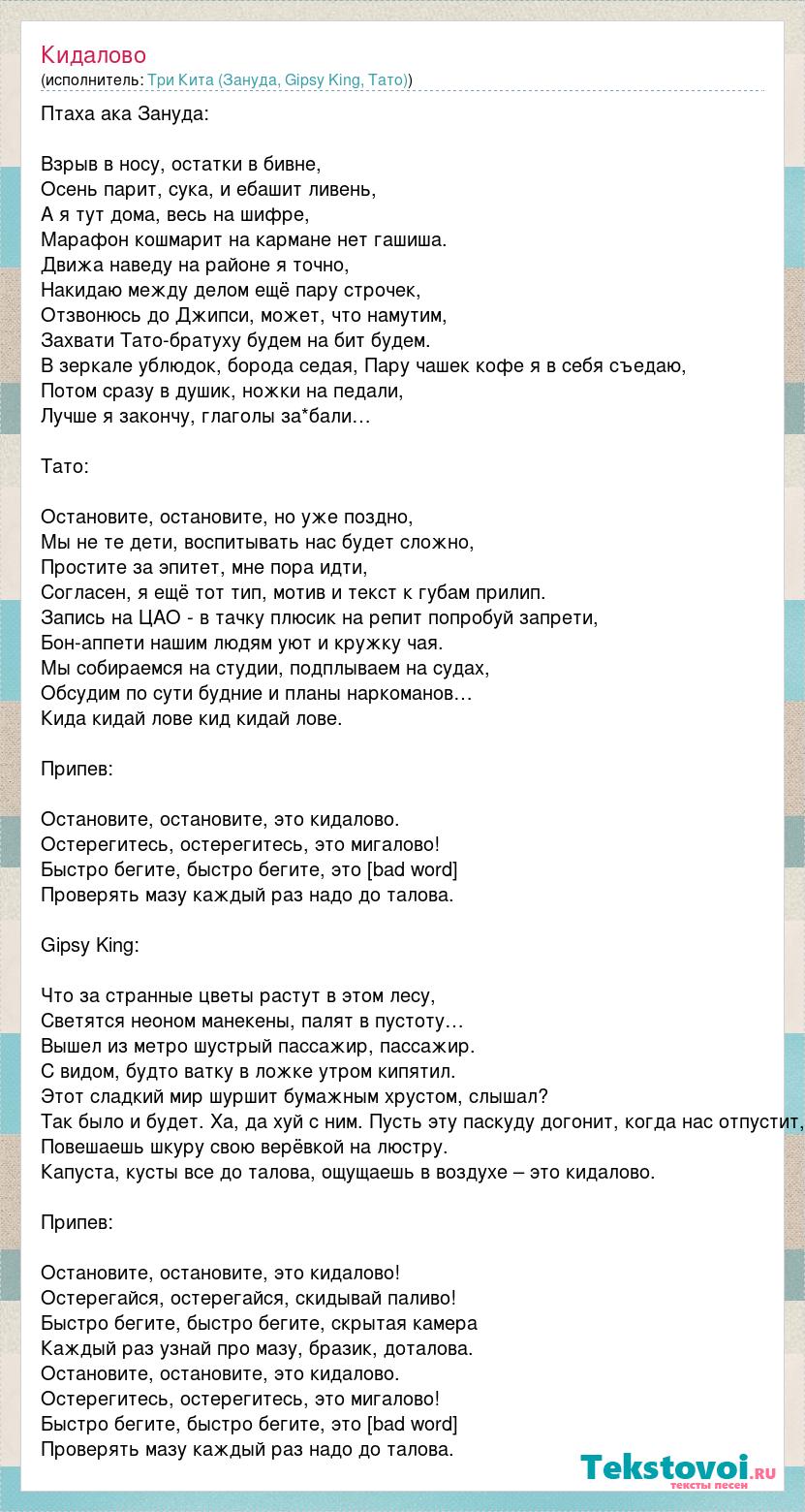 Птаха ака Зануда: Взрыв в носу, остатки в бивне, Осень парит, сука, и ебашит ливень, А я тут дома, весь на шифре, Марафон кошмарит на кармане нет гашиша. Движа наведу на районе я точно, Накидаю между делом ещё пару строчек, Отзвонюсь до Джипси, может, что намутим, Захвати Тато-братуху будем на бит будем. В зеркале ублюдок, борода седая, Пару чашек кофе я в себя съедаю, Потом сразу в душик, ножки на педали, Лучше я закончу, глаголы за*бали… Тато: Остановите, остановите, но уже поздно, Мы не те дети, воспитывать нас будет сложно, Простите за эпитет, мне пора идти, Согласен, я ещё тот тип, мотив и текст к губам прилип. Запись на ЦАО - в тачку плюсик на репит попробуй запрети, Бон-аппети нашим людям уют и кружку чая. Мы собираемся на студии, подплываем на судах, Обсудим по сути будние и планы наркоманов… Кида кидай лове кид кидай лове. Припев: Остановите, остановите, это кидалово. Остерегитесь, остерегитесь, это мигалово! Быстро бегите, быстро бегите, это [bad word] Проверять мазу каждый раз надо до талова. Gipsy King: Что за странные цветы растут в этом лесу, Светятся неоном манекены, палят в пустоту… Вышел из метро шустрый пассажир, пассажир. С видом, будто ватку в ложке утром кипятил. Этот сладкий мир шуршит бумажным хрустом, слышал? Так было и будет. Ха, да хуй с ним. Пусть эту паскуду догонит, когда нас отпустит, Повешаешь шкуру свою верёвкой на люстру. Капуста, кусты все до талова, ощущаешь в воздухе – это кидалово. Припев: Остановите, остановите, это кидалово! Остерегайся, остерегайся, скидывай паливо! Быстро бегите, быстро бегите, скрытая камера Каждый раз узнай про мазу, бразик, доталова. Остановите, остановите, это кидалово. Остерегитесь, остерегитесь, это мигалово! Быстро бегите, быстро бегите, это [bad word] Проверять мазу каждый раз надо до талова.