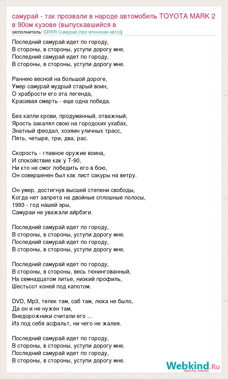 Последний самурай идет по городу, В стороны, в стороны, уступи дорогу мне. Последний самурай идет по городу, В стороны, в стороны, уступи дорогу мне. Раннею весной на большой дороге, Умер самурай мудрый старый воин, О храбрости его эта легенда, Красивая смерть - еще одна победа. Без капли крови, продуманный, отважный, Ярость закалял свою на городских ухабах, Знатный феодал, хозяин уличных трасс, Пять, четыре, три, два, рас. Скорость - главное оружие воина, И спокойствие как у Т-90, Ни кто не смог победить его в бою, Он совершенен был как лист сакуры на ветру. Он умер, достигнув высшей степени свободы, Когда нет запрета на двойные сплошные полосы, 1993 - год нашей эры, Самураи не уважали айрбэги. Последний самурай идет по городу, В стороны, в стороны, уступи дорогу мне. Последний самурай идет по городу, В стороны, в стороны, уступи дорогу мне. Последний самурай идет по городу, В стороны, в стороны, весь тюнингованный, На семнадцатом литье, низкий профиль, Шестьсот коней под капотом. DVD, Mp3, телек там, саб там, люка не было, Да он и не нужен там, Внедорожники считали его ... Из под себя асфальт, ни чего не жалея. Последний самурай идет по городу, В стороны, в стороны, уступи дорогу мне. Последний самурай идет по городу, В стороны, в стороны, уступи дорогу мне.