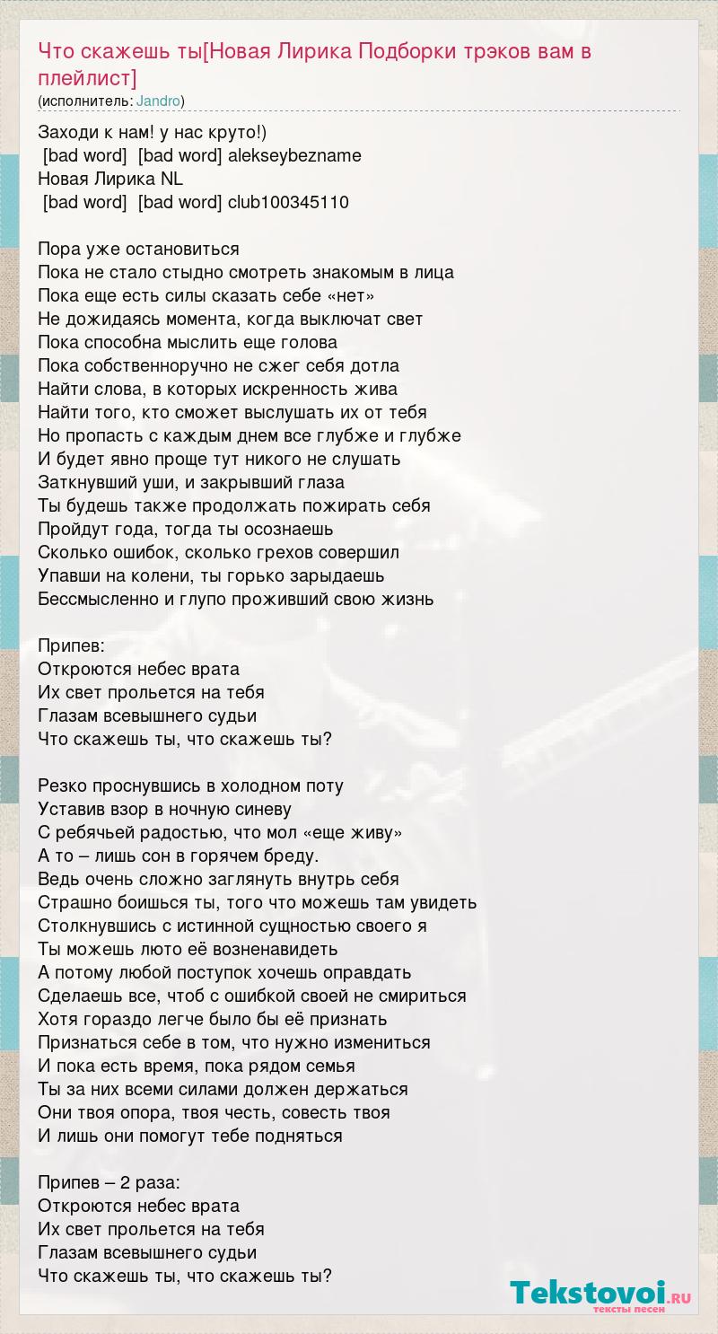 Заходи к нам! у нас круто!) [bad word] [bad word] alekseybezname Новая Лирика NL [bad word] [bad word] club100345110 Пора уже остановиться Пока не стало стыдно смотреть знакомым в лица Пока еще есть силы сказать себе «нет» Не дожидаясь момента, когда выключат свет Пока способна мыслить еще голова Пока собственноручно не сжег себя дотла Найти слова, в которых искренность жива Найти того, кто сможет выслушать их от тебя Но пропасть с каждым днем все глубже и глубже И будет явно проще тут никого не слушать Заткнувший уши, и закрывший глаза Ты будешь также продолжать пожирать себя Пройдут года, тогда ты осознаешь Сколько ошибок, сколько грехов совершил Упавши на колени, ты горько зарыдаешь Бессмысленно и глупо проживший свою жизнь Припев: Откроются небес врата Их свет прольется на тебя Глазам всевышнего судьи Что скажешь ты, что скажешь ты? Резко проснувшись в холодном поту Уставив взор в ночную синеву С ребячьей радостью, что мол «еще живу» А то – лишь сон в горячем бреду. Ведь очень сложно заглянуть внутрь себя Страшно боишься ты, того что можешь там увидеть Столкнувшись с истинной сущностью своего я Ты можешь люто её возненавидеть А потому любой поступок хочешь оправдать Сделаешь все, чтоб с ошибкой своей не смириться Хотя гораздо легче было бы её признать Признаться себе в том, что нужно измениться И пока есть время, пока рядом семья Ты за них всеми силами должен держаться Они твоя опора, твоя честь, совесть твоя И лишь они помогут тебе подняться Припев – 2 раза: Откроются небес врата Их свет прольется на тебя Глазам всевышнего судьи Что скажешь ты, что скажешь ты?