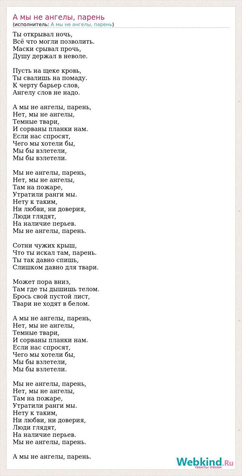 Ты открывал ночь, Всё что могли позволить. Маски срывал прочь, Душу держал в неволе. Пусть на щеке кровь, Ты свалишь на помаду. К черту барьер слов, Ангелу слов не надо. А мы не ангелы, парень, Нет, мы не ангелы, Темные твари, И сорваны планки нам. Если нас спросят, Чего мы хотели бы, Мы бы взлетели, Мы бы взлетели. Мы не ангелы, парень, Нет, мы не ангелы, Там на пожаре, Утратили ранги мы. Нету к таким, Ни любви, ни доверия, Люди глядят, На наличие перьев. Мы не ангелы, парень. Сотни чужих крыш, Что ты искал там, парень. Ты так давно спишь, Слишком давно для твари. Может пора вниз, Там где ты дышишь телом. Брось свой пустой лист, Твари не ходят в белом. А мы не ангелы, парень, Нет, мы не ангелы, Темные твари, И сорваны планки нам. Если нас спросят, Чего мы хотели бы, Мы бы взлетели, Мы бы взлетели. Мы не ангелы, парень, Нет, мы не ангелы, Там на пожаре, Утратили ранги мы. Нету к таким, Ни любви, ни доверия, Люди глядят, На наличие перьев. Мы не ангелы, парень. А мы не ангелы, парень.