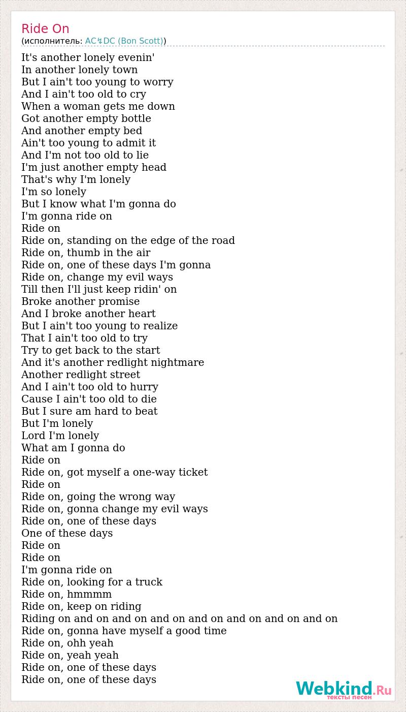 It's another lonely evenin' In another lonely town But I ain't too young to worry And I ain't too old to cry When a woman gets me down Got another empty bottle And another empty bed Ain't too young to admit it And I'm not too old to lie I'm just another empty head That's why I'm lonely I'm so lonely But I know what I'm gonna do I'm gonna ride on Ride on Ride on, standing on the edge of the road Ride on, thumb in the air Ride on, one of these days I'm gonna Ride on, change my evil ways Till then I'll just keep ridin' on Broke another promise And I broke another heart But I ain't too young to realize That I ain't too old to try Try to get back to the start And it's another redlight nightmare Another redlight street And I ain't too old to hurry Cause I ain't too old to die But I sure am hard to beat But I'm lonely Lord I'm lonely What am I gonna do Ride on Ride on, got myself a one-way ticket Ride on Ride on, going the wrong way Ride on, gonna change my evil ways Ride on, one of these days One of these days Ride on Ride on I'm gonna ride on Ride on, looking for a truck Ride on, hmmmm Ride on, keep on riding Riding on and on and on and on and on and on and on and on Ride on, gonna have myself a good time Ride on, ohh yeah Ride on, yeah yeah Ride on, one of these days Ride on, one of these days