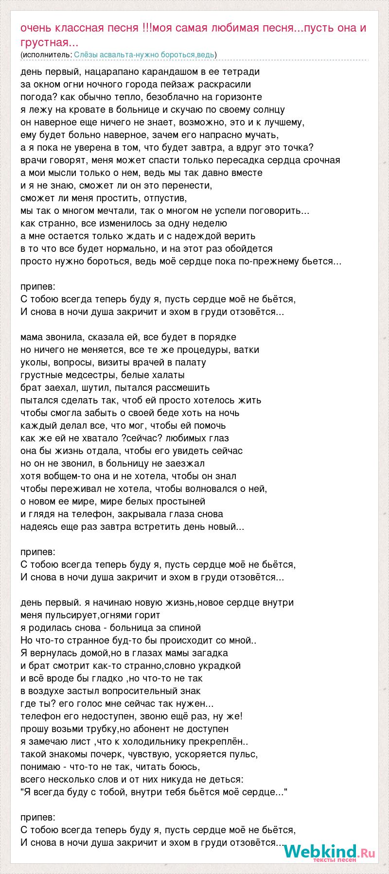 день первый, нацарапано карандашом в ее тетради за окном огни ночного города пейзаж раскрасили погода? как обычно тепло, безоблачно на горизонте я лежу на кровате в больнице и скучаю по своему солнцу он наверное еще ничего не знает, возможно, это и к лучшему, ему будет больно наверное, зачем его напрасно мучать, а я пока не уверена в том, что будет завтра, а вдруг это точка? врачи говорят, меня может спасти только пересадка сердца срочная а мои мысли только о нем, ведь мы так давно вместе и я не знаю, сможет ли он это перенести, сможет ли меня простить, отпустив, мы так о многом мечтали, так о многом не успели поговорить... как странно, все изменилось за одну неделю а мне остается только ждать и с надеждой верить в то что все будет нормально, и на этот раз обойдется просто нужно бороться, ведь моё сердце пока по-прежнему бьется... припев: С тобою всегда теперь буду я, пусть сердце моё не бьётся, И снова в ночи душа закричит и эхом в груди отзовётся... мама звонила, сказала ей, все будет в порядке но ничего не меняется, все те же процедуры, ватки уколы, вопросы, визиты врачей в палату грустные медсестры, белые халаты брат заехал, шутил, пытался рассмешить пытался сделать так, чтоб ей просто хотелось жить чтобы смогла забыть о своей беде хоть на ночь каждый делал все, что мог, чтобы ей помочь как же ей не хватало ?сейчас? любимых глаз она бы жизнь отдала, чтобы его увидеть сейчас но он не звонил, в больницу не заезжал хотя вобщем-то она и не хотела, чтобы он знал чтобы переживал не хотела, чтобы волновался о ней, о новом ее мире, мире белых простыней и глядя на телефон, закрывала глаза снова надеясь еще раз завтра встретить день новый... припев: С тобою всегда теперь буду я, пусть сердце моё не бьётся, И снова в ночи душа закричит и эхом в груди отзовётся... день первый. я начинаю новую жизнь,новое сердце внутри меня пульсирует,огнями горит я родилась снова - больница за спиной Но что-то странное буд-то бы происходит со мной.. Я вернулась домой,но в глазах мамы загадка и брат смотрит как-то странно,словно украдкой и всё вроде бы гладко ,но что-то не так в воздухе застыл вопросительный знак где ты? его голос мне сейчас так нужен... телефон его недоступен, звоню ещё раз, ну же! прошу возьми трубку,но абонент не доступен я замечаю лист ,что к холодильнику прекреплён.. такой знакомы почерк, чувствую, ускоряется пульс, понимаю - что-то не так, читать боюсь, всего несколько слов и от них никуда не деться: "Я всегда буду с тобой, внутри тебя бьётся моё сердце..." припев: С тобою всегда теперь буду я, пусть сердце моё не бьётся, И снова в ночи душа закричит и эхом в груди отзовётся...