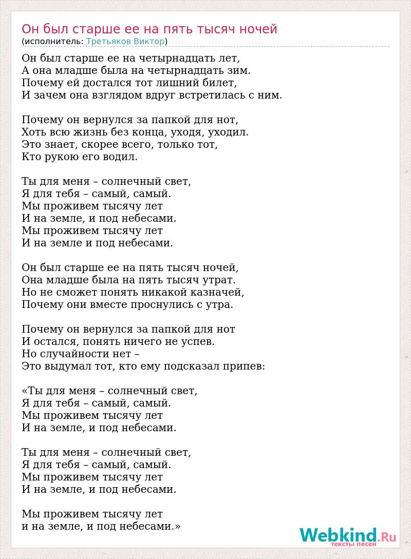 Он был старше ее на четырнадцать лет, А она младше была на четырнадцать зим. Почему ей достался тот лишний билет, И зачем она взглядом вдруг встретилась с ним. Почему он вернулся за папкой для нот, Хоть всю жизнь без конца, уходя, уходил. Это знает, скорее всего, только тот, Кто рукою его водил. Ты для меня – солнечный свет, Я для тебя – самый, самый. Мы проживем тысячу лет И на земле, и под небесами. Мы проживем тысячу лет И на земле и под небесами. Он был старше ее на пять тысяч ночей, Она младше была на пять тысяч утрат. Но не сможет понять никакой казначей, Почему они вместе проснулись с утра. Почему он вернулся за папкой для нот И остался, понять ничего не успев. Но случайности нет – Это выдумал тот, кто ему подсказал припев: «Ты для меня – солнечный свет, Я для тебя – самый, самый. Мы проживем тысячу лет И на земле, и под небесами. Ты для меня – солнечный свет, Я для тебя – самый, самый. Мы проживем тысячу лет И на земле, и под небесами. Мы проживем тысячу лет и на земле, и под небесами.»