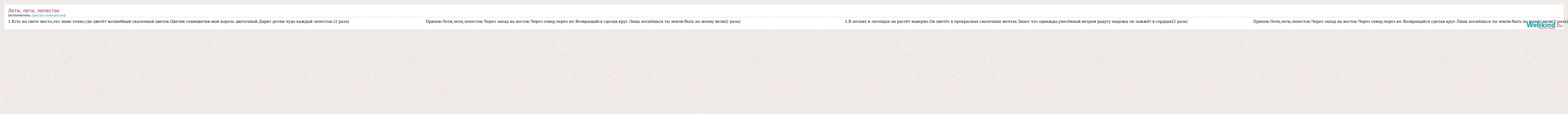 1.Есть на свете место,это знаю точно,где цветёт волшебный сказочный цветок.Цветик семицветик-мой король цветочный.Дарит детям чудо каждый лепесток.(2 раза) Припев:Лети,лети,лепесток.Через запад на восток.Через север,через юг.Возвращайся сделав круг.Лишь коснёшься ты земли-быть по моему вели(2 раза) 2.В песнях и легендах он растёт наверно.Он цветёт в прекрасных сказочных мечтах.Знает что однажды,унесённый ветром радугу надежы он зажжёт в сердцах(2 раза) Припев:Лети,лети,лепесток.Через запад на восток.Через север,через юг.Возвращайся сделав круг.Лишь коснёшься ты земли-быть по моему вели(2 раза)