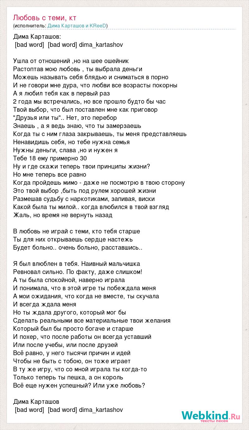 Дима Карташов: [bad word] [bad word] dima_kartashov Ушла от отношений ,но на шее ошейник Растоптав мою любовь , ты выбрала деньги Можешь называть себя блядью и сниматься в порно И не говори мне дура, что любви все возрасты покорны А я любил тебя как в первый раз 2 года мы встречались, но все прошло будто бы час Твой выбор, что был поставлен мне как приговор "Друзья или ты".. Нет, это перебор Знаешь , а я ведь знаю, что ты замерзаешь Когда ты с ним глаза закрываешь, ты меня представляешь Ненавидишь себя, но тебе нужна семья Нужны деньги, слава ,но и нужен я Тебе 18 ему примерно 30 Ну и где скажи теперь твои принципы жизни? Но мне теперь все равно Когда пройдешь мимо - даже не посмотрю в твою сторону Это твой выбор ,быть под рулем хорошей жизни Размешав судьбу с наркотиками, запивая, виски Какой была ты милой.. когда влюбился в твой взгляд Жаль, но время не вернуть назад В любовь не играй с теми, кто тебя старше Ты для них открываешь сердце настежь Будет больно.. очень больно, расставшись.. Я был влюблен в тебя. Наивный мальчишка Ревновал сильно. По факту, даже слишком! А ты была спокойной, наверно играла И понимала, что в этой игре ты побеждала меня А мои ожидания, что когда не вместе, ты скучала И всегда ждала меня Но ты ждала другого, который мог бы Сделать реальными все материальные твои желания Который был бы просто богаче и старше И похер, что после работы он всегда уставший Или после учебы, или после друзей Всё равно, у него тысячи причин и идей Чтобы не быть с тобою, он тоже играет В ту же игру, что со мной играла ты когда-то Только теперь ты пешка, а он король Всё еще нужен успешный? Или уже любовь? Дима Карташов [bad word] [bad word] dima_kartashov