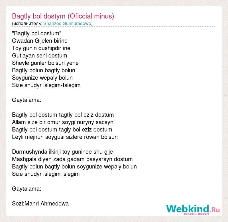 "Bagtly bol dostum" Owadan Gijelen birine Toy gunin dushipdir ine Gutlayan seni dostum Sheyle gunler bolsun yene Bagtly bolun bagtly bolun Soygunize wepaly bolun Size shudyr islegim-Islegim Gaytalama: Bagtly bol dostum tagtly bol eziz dostum Allam size bir omur soygi nuryny sacsyn Bagtly bol dostum tagly bol eziz dostum Leyli mejnun soygusi sizlere rowan bolsun Durmushynda ilkinji toy guninde shu gije Mashgala diyen zada gadam basyarsyn dostum Bagtly bolun bagtly bolun soygunize wepaly bolun Size shudyr islegim islegim Gaytalama: Sozi:Mahri Ahmedowa