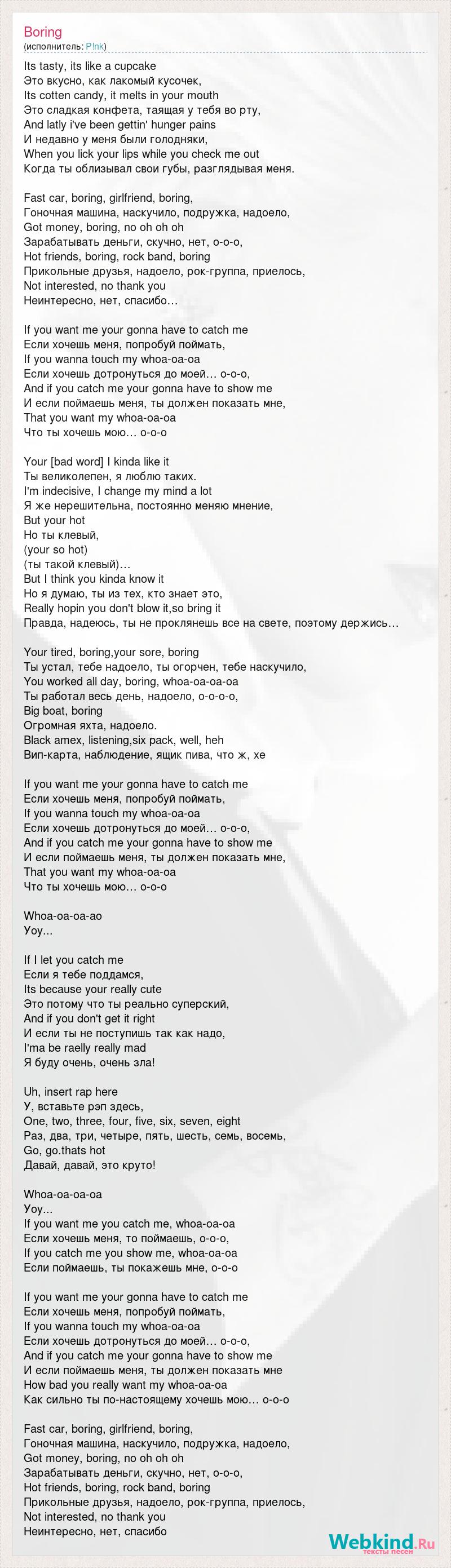 Its tasty, its like a cupcake Это вкусно, как лакомый кусочек, Its cotten candy, it melts in your mouth Это сладкая конфета, таящая у тебя во рту, And latly i've been gettin' hunger pains И недавно у меня были голодняки, When you lick your lips while you check me out Когда ты облизывал свои губы, разглядывая меня. Fast car, boring, girlfriend, boring, Гоночная машина, наскучило, подружка, надоело, Got money, boring, no oh oh oh Зарабатывать деньги, скучно, нет, о-о-о, Hot friends, boring, rock band, boring Прикольные друзья, надоело, рок-группа, приелось, Not interested, no thank you Неинтересно, нет, спасибо… If you want me your gonna have to catch me Если хочешь меня, попробуй поймать, If you wanna touch my whoa-oa-oa Если хочешь дотронуться до моей… о-о-о, And if you catch me your gonna have to show me И если поймаешь меня, ты должен показать мне, That you want my whoa-oa-oa Что ты хочешь мою… о-о-о Your [bad word] I kinda like it Ты великолепен, я люблю таких. I'm indecisive, I change my mind a lot Я же нерешительна, постоянно меняю мнение, But your hot Но ты клевый, (your so hot) (ты такой клевый)… But I think you kinda know it Но я думаю, ты из тех, кто знает это, Really hopin you don't blow it,so bring it Правда, надеюсь, ты не проклянешь все на свете, поэтому держись… Your tired, boring,your sore, boring Ты устал, тебе надоело, ты огорчен, тебе наскучило, You worked all day, boring, whoa-oa-oa-oa Ты работал весь день, надоело, о-о-о-о, Big boat, boring Огромная яхта, надоело. Black amex, listening,six pack, well, heh Вип-карта, наблюдение, ящик пива, что ж, хе If you want me your gonna have to catch me Если хочешь меня, попробуй поймать, If you wanna touch my whoa-oa-oa Если хочешь дотронуться до моей… о-о-о, And if you catch me your gonna have to show me И если поймаешь меня, ты должен показать мне, That you want my whoa-oa-oa Что ты хочешь мою… о-о-о Whoa-oa-oa-ao Уоу... If I let you catch me Если я тебе поддамся, Its because your really cute Это потому что ты реально суперский, And if you don't get it right И если ты не поступишь так как надо, I'ma be raelly really mad Я буду очень, очень зла! Uh, insert rap here У, вставьте рэп здесь, One, two, three, four, five, six, seven, eight Раз, два, три, четыре, пять, шесть, семь, восемь, Go, go.thats hot Давай, давай, это круто! Whoa-oa-oa-oa Уоу... If you want me you catch me, whoa-oa-oa Если хочешь меня, то поймаешь, о-о-о, If you catch me you show me, whoa-oa-oa Если поймаешь, ты покажешь мне, о-о-о If you want me your gonna have to catch me Если хочешь меня, попробуй поймать, If you wanna touch my whoa-oa-oa Если хочешь дотронуться до моей… о-о-о, And if you catch me your gonna have to show me И если поймаешь меня, ты должен показать мне How bad you really want my whoa-oa-oa Как сильно ты по-настоящему хочешь мою… о-о-о Fast car, boring, girlfriend, boring, Гоночная машина, наскучило, подружка, надоело, Got money, boring, no oh oh oh Зарабатывать деньги, скучно, нет, о-о-о, Hot friends, boring, rock band, boring Прикольные друзья, надоело, рок-группа, приелось, Not interested, no thank you Неинтересно, нет, спасибо