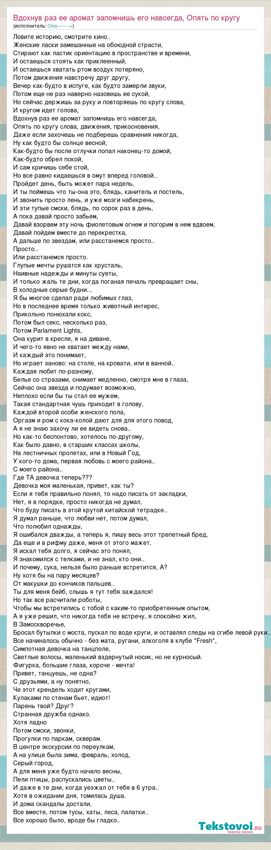 А как ты думаешь, о чем песня "Вдохнув раз ее аромат запомнишь его навсегда, Опять по кругу слова, движения, пр" ?