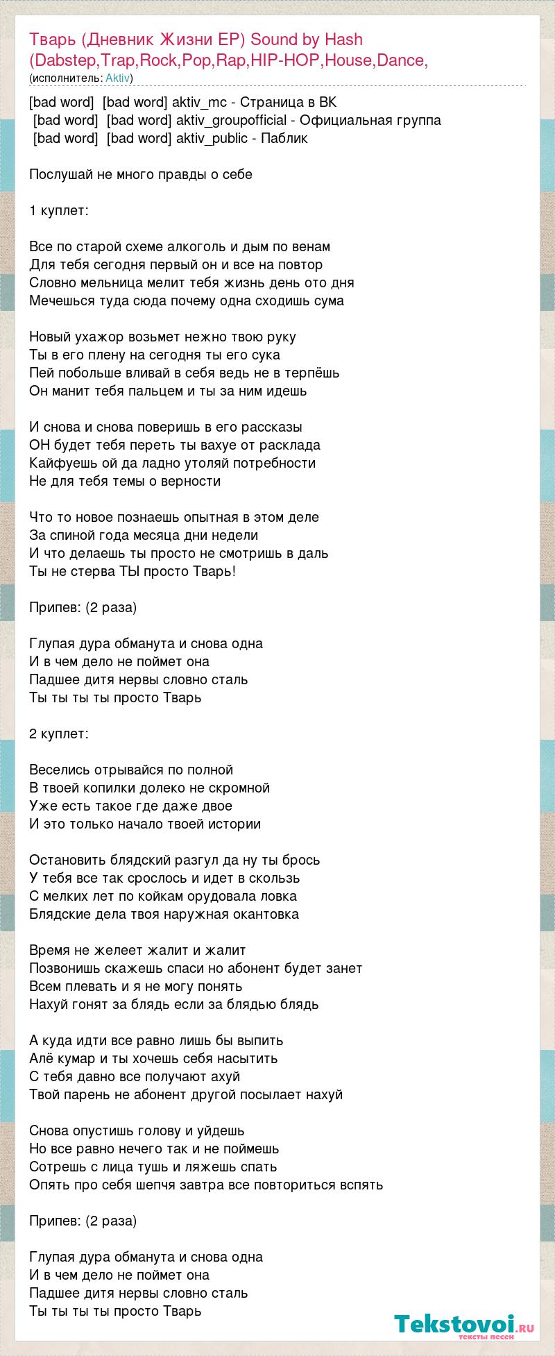 [bad word] [bad word] aktiv_mc - Страница в ВК [bad word] [bad word] aktiv_groupofficial - Официальная группа [bad word] [bad word] aktiv_public - Паблик Послушай не много правды о себе 1 куплет: Все по старой схеме алкоголь и дым по венам Для тебя сегодня первый он и все на повтор Словно мельница мелит тебя жизнь день ото дня Мечешься туда сюда почему одна сходишь сума Новый ухажор возьмет нежно твою руку Ты в его плену на сегодня ты его сука Пей побольше вливай в себя ведь не в терпёшь Он манит тебя пальцем и ты за ним идешь И снова и снова поверишь в его рассказы ОН будет тебя переть ты вахуе от расклада Кайфуешь ой да ладно утоляй потребности Не для тебя темы о верности Что то новое познаешь опытная в этом деле За спиной года месяца дни недели И что делаешь ты просто не смотришь в даль Ты не стерва ТЫ просто Тварь! Припев: (2 раза) Глупая дура обманута и снова одна И в чем дело не поймет она Падшее дитя нервы словно сталь Ты ты ты ты просто Тварь 2 куплет: Веселись отрывайся по полной В твоей копилки долеко не скромной Уже есть такое где даже двое И это только начало твоей истории Остановить блядский разгул да ну ты брось У тебя все так срослось и идет в скользь С мелких лет по койкам орудовала ловка Блядские дела твоя наружная окантовка Время не желеет жалит и жалит Позвонишь скажешь спаси но абонент будет занет Всем плевать и я не могу понять Нахуй гонят за блядь если за блядью блядь А куда идти все равно лишь бы выпить Алё кумар и ты хочешь себя насытить С тебя давно все получают ахуй Твой парень не абонент другой посылает нахуй Снова опустишь голову и уйдешь Но все равно нечего так и не поймешь Сотрешь с лица тушь и ляжешь спать Опять про себя шепчя завтра все повториться вспять Припев: (2 раза) Глупая дура обманута и снова одна И в чем дело не поймет она Падшее дитя нервы словно сталь Ты ты ты ты просто Тварь