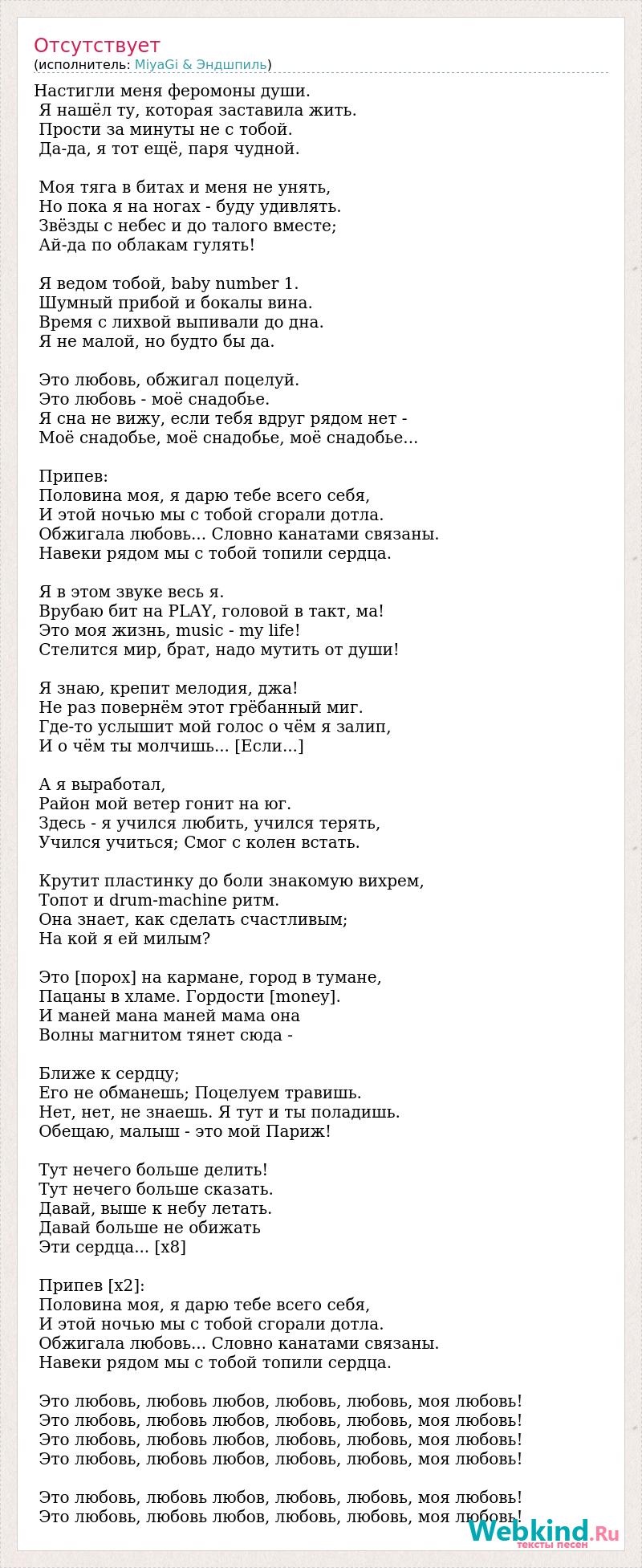 Настигли меня феромоны души. Я нашёл ту, которая заставила жить. Прости за минуты не с тобой. Да-да, я тот ещё, паря чудной. Моя тяга в битах и меня не унять, Но пока я на ногах - буду удивлять. Звёзды с небес и до талого вместе; Ай-да по облакам гулять! Я ведом тобой, baby number 1. Шумный прибой и бокалы вина. Время с лихвой выпивали до дна. Я не малой, но будто бы да. Это любовь, обжигал поцелуй. Это любовь - моё снадобье. Я сна не вижу, если тебя вдруг рядом нет - Моё снадобье, моё снадобье, моё снадобье... Припев: Половина моя, я дарю тебе всего себя, И этой ночью мы с тобой сгорали дотла. Обжигала любовь... Словно канатами связаны. Навеки рядом мы с тобой топили сердца. Я в этом звуке весь я. Врубаю бит на PLAY, головой в такт, ма! Это моя жизнь, music - my life! Стелится мир, брат, надо мутить от души! Я знаю, крепит мелодия, джа! Не раз повернём этот грёбанный миг. Где-то услышит мой голос о чём я залип, И о чём ты молчишь... [Если...] А я выработал, Район мой ветер гонит на юг. Здесь - я учился любить, учился терять, Учился учиться; Смог с колен встать. Крутит пластинку до боли знакомую вихрем, Топот и drum-machine ритм. Она знает, как сделать счастливым; На кой я ей милым? Это [порох] на кармане, город в тумане, Пацаны в хламе. Гордости [money]. И маней мана маней мама она Волны магнитом тянет сюда - Ближе к сердцу; Его не обманешь; Поцелуем травишь. Нет, нет, не знаешь. Я тут и ты поладишь. Обещаю, малыш - это мой Париж! Тут нечего больше делить! Тут нечего больше сказать. Давай, выше к небу летать. Давай больше не обижать Эти сердца... [x8] Припев [x2]: Половина моя, я дарю тебе всего себя, И этой ночью мы с тобой сгорали дотла. Обжигала любовь... Словно канатами связаны. Навеки рядом мы с тобой топили сердца. Это любовь, любовь любов, любовь, любовь, моя любовь! Это любовь, любовь любов, любовь, любовь, моя любовь! Это любовь, любовь любов, любовь, любовь, моя любовь! Это любовь, любовь любов, любовь, любовь, моя любовь! Это любовь, любовь любов, любовь, любовь, моя любовь! Это любовь, любовь любов, любовь, любовь, моя любовь!
