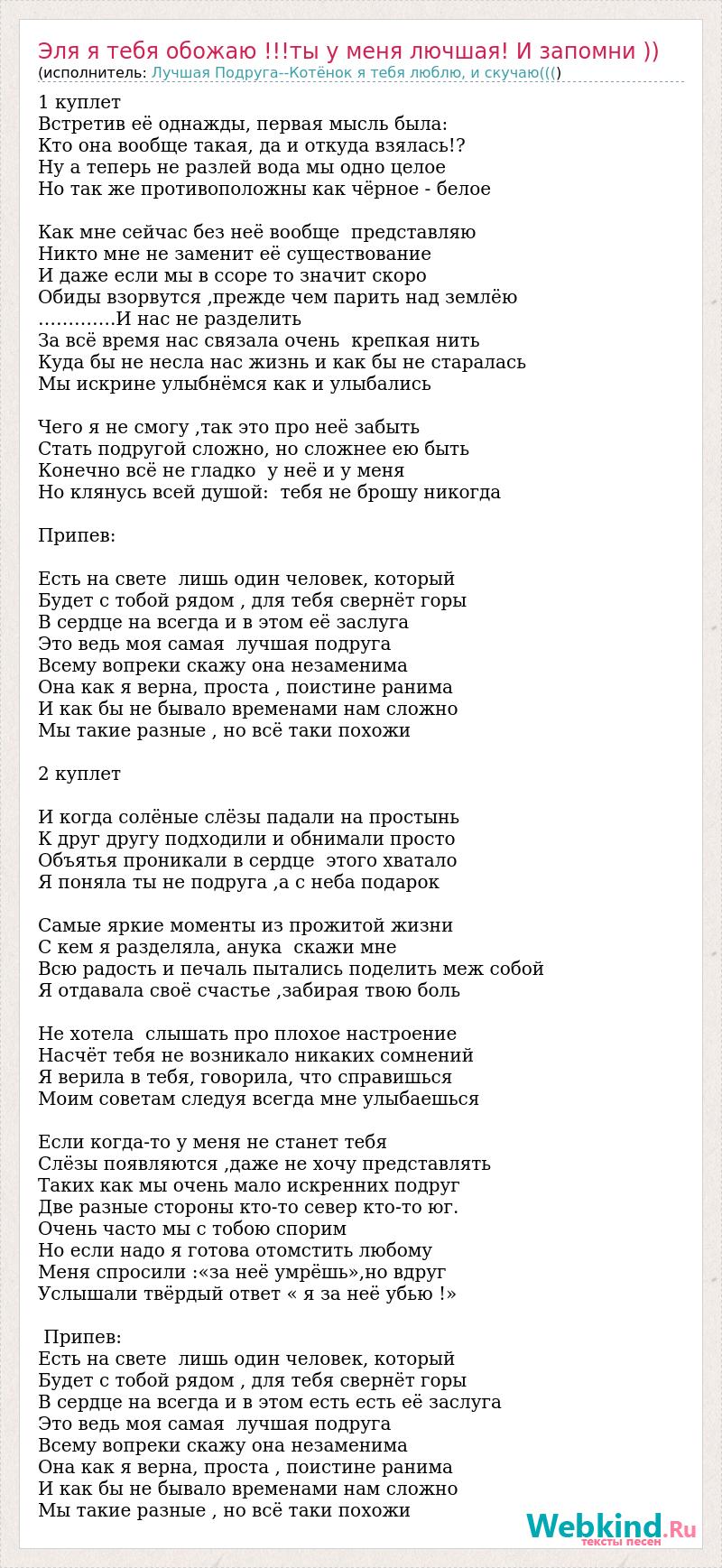 1 куплет Встретив её однажды, первая мысль была: Кто она вообще такая, да и откуда взялась!? Ну а теперь не разлей вода мы одно целое Но так же противоположны как чёрное - белое Как мне сейчас без неё вообще представляю Никто мне не заменит её существование И даже если мы в ссоре то значит скоро Обиды взорвутся ,прежде чем парить над землёю ………….И нас не разделить За всё время нас связала очень крепкая нить Куда бы не несла нас жизнь и как бы не старалась Мы искрине улыбнёмся как и улыбались Чего я не смогу ,так это про неё забыть Стать подругой сложно, но сложнее ею быть Конечно всё не гладко у неё и у меня Но клянусь всей душой: тебя не брошу никогда Припев: Есть на свете лишь один человек, который Будет с тобой рядом , для тебя свернёт горы В сердце на всегда и в этом её заслуга Это ведь моя самая лучшая подруга Всему вопреки скажу она незаменима Она как я верна, проста , поистине ранима И как бы не бывало временами нам сложно Мы такие разные , но всё таки похожи 2 куплет И когда солёные слёзы падали на простынь К друг другу подходили и обнимали просто Объятья проникали в сердце этого хватало Я поняла ты не подруга ,а с неба подарок Самые яркие моменты из прожитой жизни С кем я разделяла, анука скажи мне Всю радость и печаль пытались поделить меж собой Я отдавала своё счастье ,забирая твою боль Не хотела слышать про плохое настроение Насчёт тебя не возникало никаких сомнений Я верила в тебя, говорила, что справишься Моим советам следуя всегда мне улыбаешься Если когда-то у меня не станет тебя Слёзы появляются ,даже не хочу представлять Таких как мы очень мало искренних подруг Две разные стороны кто-то север кто-то юг. Очень часто мы с тобою спорим Но если надо я готова отомстить любому Меня спросили :«за неё умрёшь»,но вдруг Услышали твёрдый ответ « я за неё убью !» Припев: Есть на свете лишь один человек, который Будет с тобой рядом , для тебя свернёт горы В сердце на всегда и в этом есть есть её заслуга Это ведь моя самая лучшая подруга Всему вопреки скажу она незаменима Она как я верна, проста , поистине ранима И как бы не бывало временами нам сложно Мы такие разные , но всё таки похожи