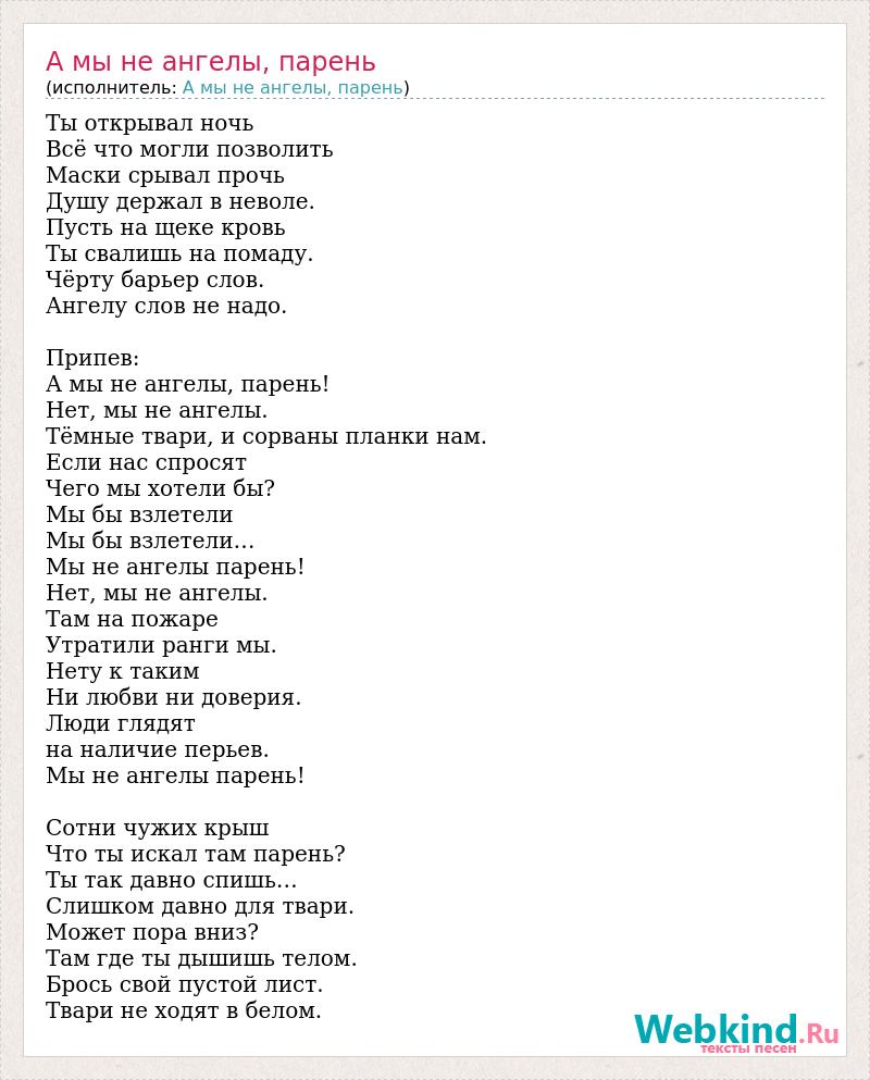 Ты открывал ночь Всё что могли позволить Маски срывал прочь Душу держал в неволе. Пусть на щеке кровь Ты свалишь на помаду. Чёрту барьер слов. Ангелу слов не надо. Припев: А мы не ангелы, парень! Нет, мы не ангелы. Тёмные твари, и сорваны планки нам. Если нас спросят Чего мы хотели бы? Мы бы взлетели Мы бы взлетели… Мы не ангелы парень! Нет, мы не ангелы. Там на пожаре Утратили ранги мы. Нету к таким Ни любви ни доверия. Люди глядят на наличие перьев. Мы не ангелы парень! Сотни чужих крыш Что ты искал там парень? Ты так давно спишь… Слишком давно для твари. Может пора вниз? Там где ты дышишь телом. Брось свой пустой лист. Твари не ходят в белом.