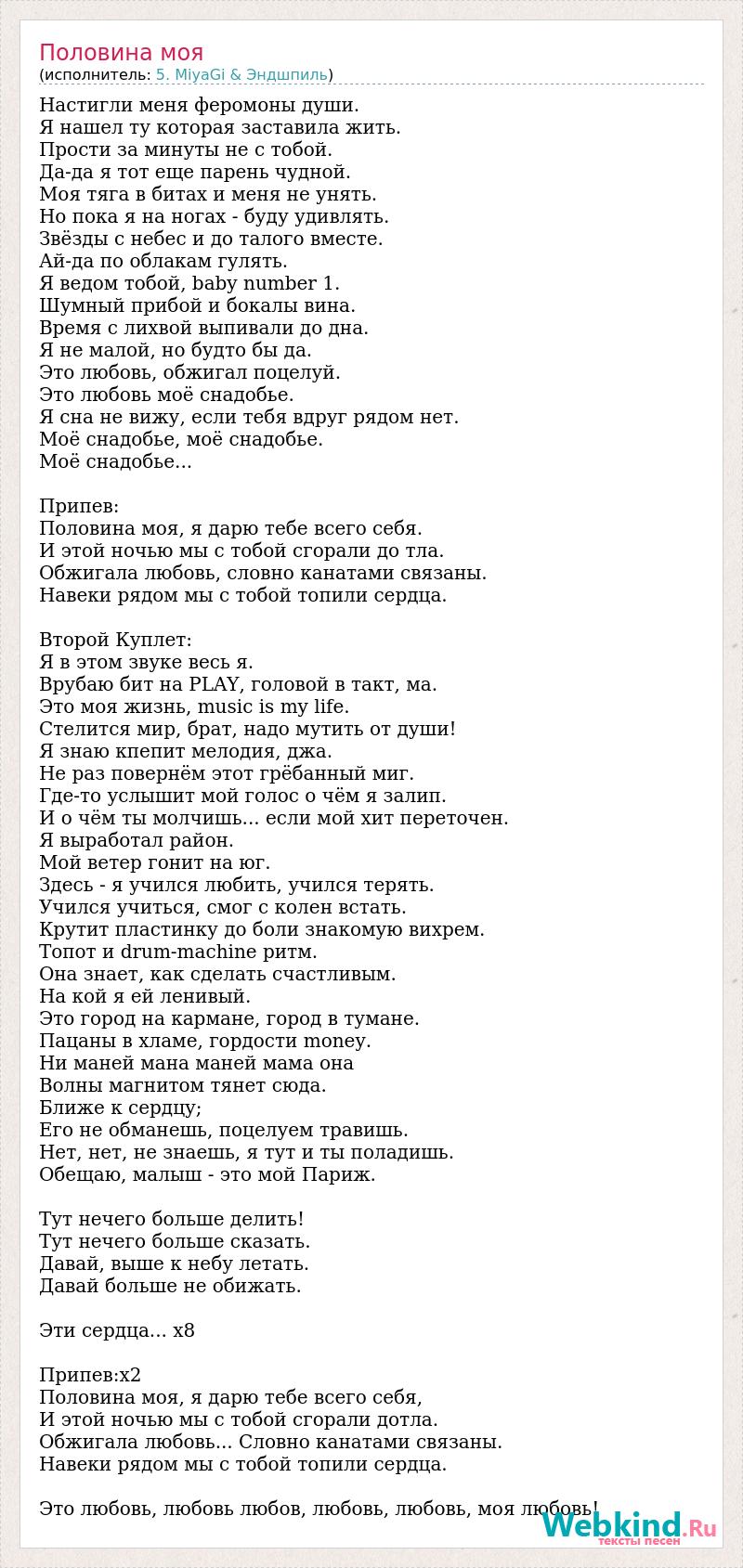 Настигли меня феромоны души. Я нашел ту которая заставила жить. Прости за минуты не с тобой. Да-да я тот еще парень чудной. Моя тяга в битах и меня не унять. Но пока я на ногах - буду удивлять. Звёзды с небес и до талого вместе. Ай-да по облакам гулять. Я ведом тобой, baby number 1. Шумный прибой и бокалы вина. Время с лихвой выпивали до дна. Я не малой, но будто бы да. Это любовь, обжигал поцелуй. Это любовь моё снадобье. Я сна не вижу, если тебя вдруг рядом нет. Моё снадобье, моё снадобье. Моё снадобье... Припев: Половина моя, я дарю тебе всего себя. И этой ночью мы с тобой сгорали до тла. Обжигала любовь, словно канатами связаны. Навеки рядом мы с тобой топили сердца. Второй Куплет: Я в этом звуке весь я. Врубаю бит на PLAY, головой в такт, ма. Это моя жизнь, music is my life. Стелится мир, брат, надо мутить от души! Я знаю кпепит мелодия, джа. Не раз повернём этот грёбанный миг. Где-то услышит мой голос о чём я залип. И о чём ты молчишь... если мой хит переточен. Я выработал район. Мой ветер гонит на юг. Здесь - я учился любить, учился терять. Учился учиться, смог с колен встать. Крутит пластинку до боли знакомую вихрем. Топот и drum-machine ритм. Она знает, как сделать счастливым. На кой я ей ленивый. Это город на кармане, город в тумане. Пацаны в хламе, гордости money. Ни маней мана маней мама она Волны магнитом тянет сюда. Ближе к сердцу; Его не обманешь, поцелуем травишь. Нет, нет, не знаешь, я тут и ты поладишь. Обещаю, малыш - это мой Париж. Тут нечего больше делить! Тут нечего больше сказать. Давай, выше к небу летать. Давай больше не обижать. Эти сердца... x8 Припев:x2 Половина моя, я дарю тебе всего себя, И этой ночью мы с тобой сгорали дотла. Обжигала любовь... Словно канатами связаны. Навеки рядом мы с тобой топили сердца. Это любовь, любовь любов, любовь, любовь, моя любовь!