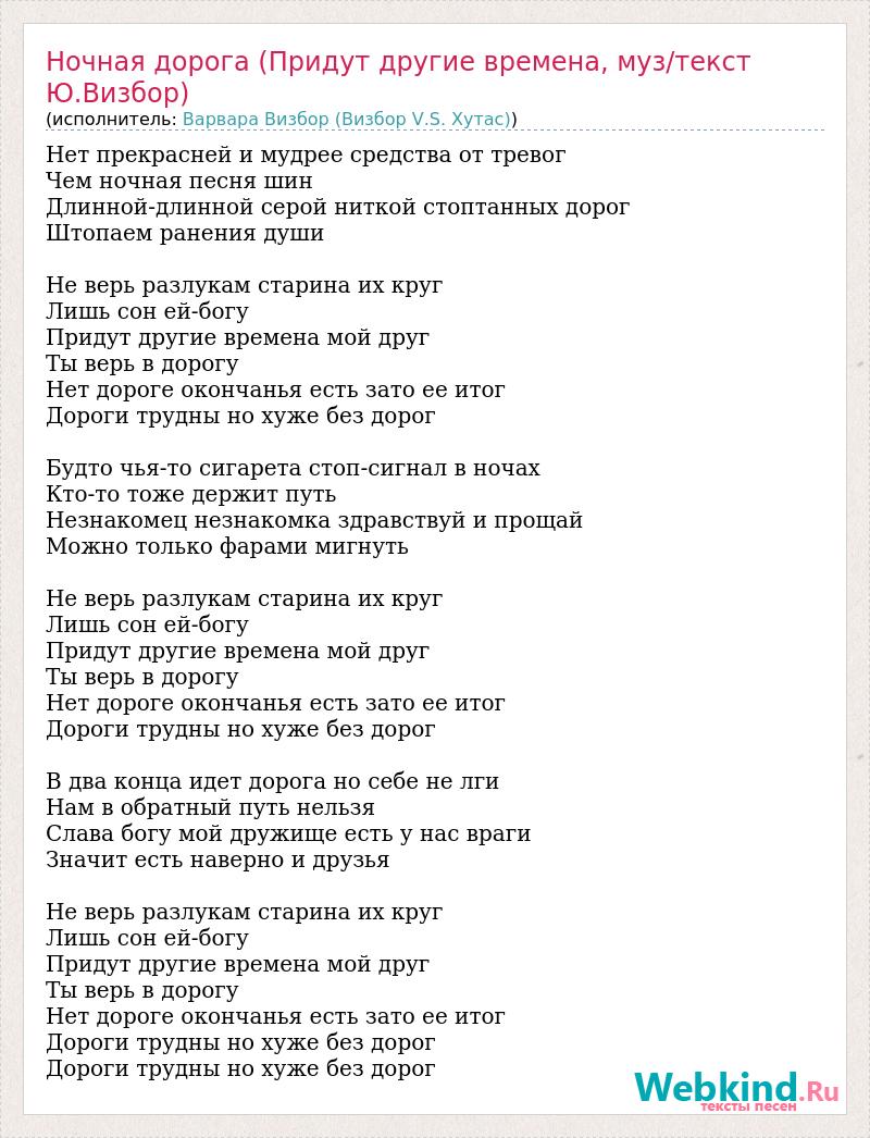 Нет прекрасней и мудрее средства от тревог Чем ночная песня шин Длинной-длинной серой ниткой стоптанных дорог Штопаем ранения души Не верь разлукам старина их круг Лишь сон ей-богу Придут другие времена мой друг Ты верь в дорогу Нет дороге окончанья есть зато ее итог Дороги трудны но хуже без дорог Будто чья-то сигарета стоп-сигнал в ночах Кто-то тоже держит путь Незнакомец незнакомка здравствуй и прощай Можно только фарами мигнуть Не верь разлукам старина их круг Лишь сон ей-богу Придут другие времена мой друг Ты верь в дорогу Нет дороге окончанья есть зато ее итог Дороги трудны но хуже без дорог В два конца идет дорога но себе не лги Нам в обратный путь нельзя Слава богу мой дружище есть у нас враги Значит есть наверно и друзья Не верь разлукам старина их круг Лишь сон ей-богу Придут другие времена мой друг Ты верь в дорогу Нет дороге окончанья есть зато ее итог Дороги трудны но хуже без дорог Дороги трудны но хуже без дорог