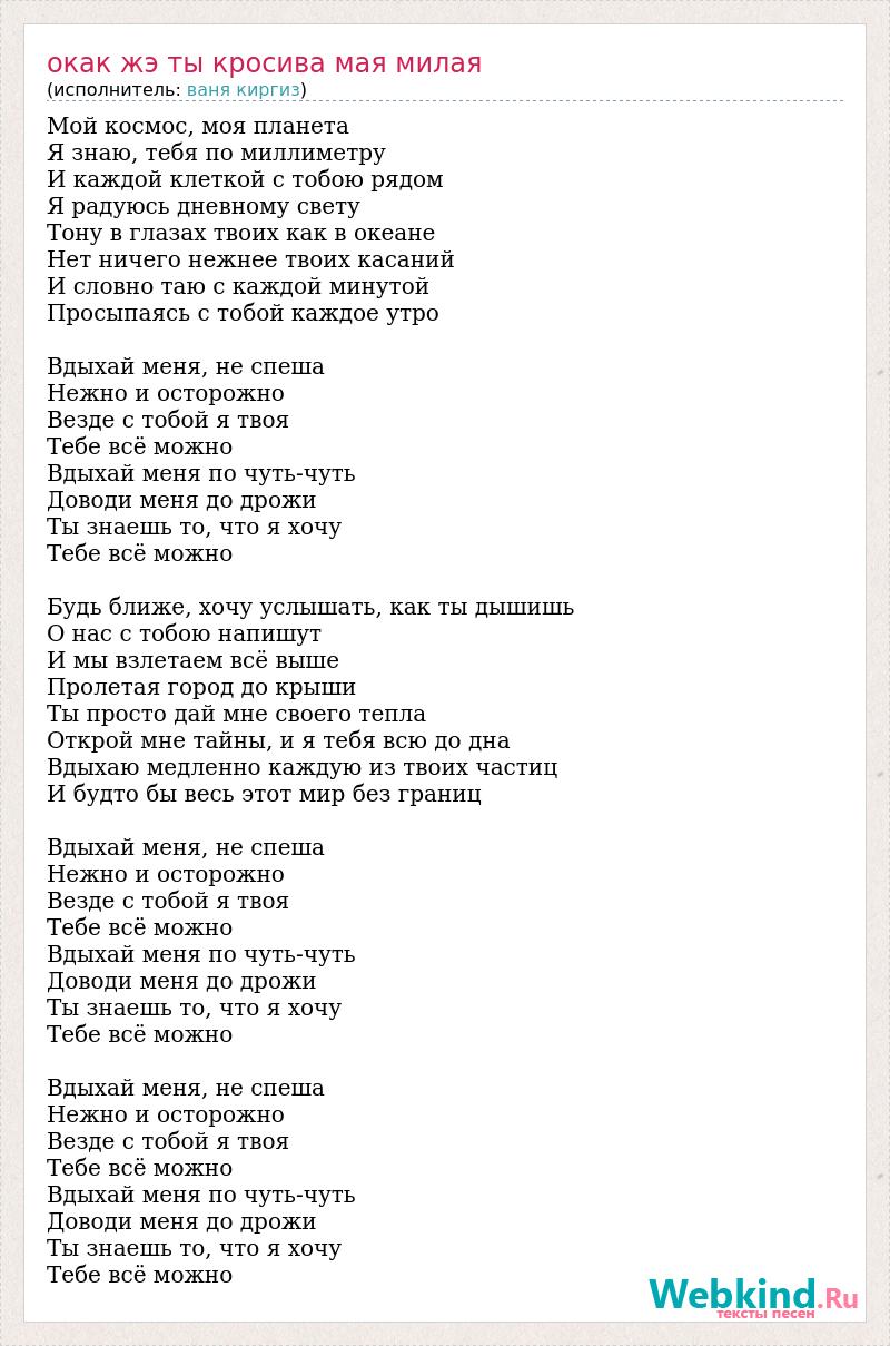 Мой космос, моя планета Я знаю, тебя по миллиметру И каждой клеткой с тобою рядом Я радуюсь дневному свету Тону в глазах твоих как в океане Нет ничего нежнее твоих касаний И словно таю с каждой минутой Просыпаясь с тобой каждое утро Вдыхай меня, не спеша Нежно и осторожно Везде с тобой я твоя Тебе всё можно Вдыхай меня по чуть-чуть Доводи меня до дрожи Ты знаешь то, что я хочу Тебе всё можно Будь ближе, хочу услышать, как ты дышишь О нас с тобою напишут И мы взлетаем всё выше Пролетая город до крыши Ты просто дай мне своего тепла Открой мне тайны, и я тебя всю до дна Вдыхаю медленно каждую из твоих частиц И будто бы весь этот мир без границ Вдыхай меня, не спеша Нежно и осторожно Везде с тобой я твоя Тебе всё можно Вдыхай меня по чуть-чуть Доводи меня до дрожи Ты знаешь то, что я хочу Тебе всё можно Вдыхай меня, не спеша Нежно и осторожно Везде с тобой я твоя Тебе всё можно Вдыхай меня по чуть-чуть Доводи меня до дрожи Ты знаешь то, что я хочу Тебе всё можно