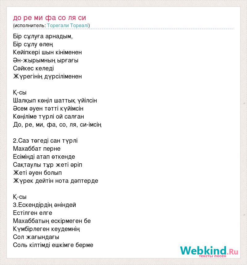 Бір сұлуға арнадым, Бір сұлу өлең Кейіпкері шын кініменен Ән-жырымның ырғағы Сәйкес келеді Жүрегінің дүрсіліменен Қ-сы Шалқып көңіл шаттық үйілсін Әсем әуен тәтті күйімсін Көңіліме түрлі ой салған До, ре, ми, фа, со, ля, си-імсің 2.Саз төгеді сан түрлі Махаббат перне Есіміңді атап өткенде Сақтаулы тұр жеті әріп Жеті әуен болып Жүрек дейтін нота дәптерде Қ-сы 3.Ескендірдің әніндей Естілген елге Махаббатың ескірмеген бе Күмбірлеген кеудемнің Сол жағындағы Соль кілтімді ешкімге берме