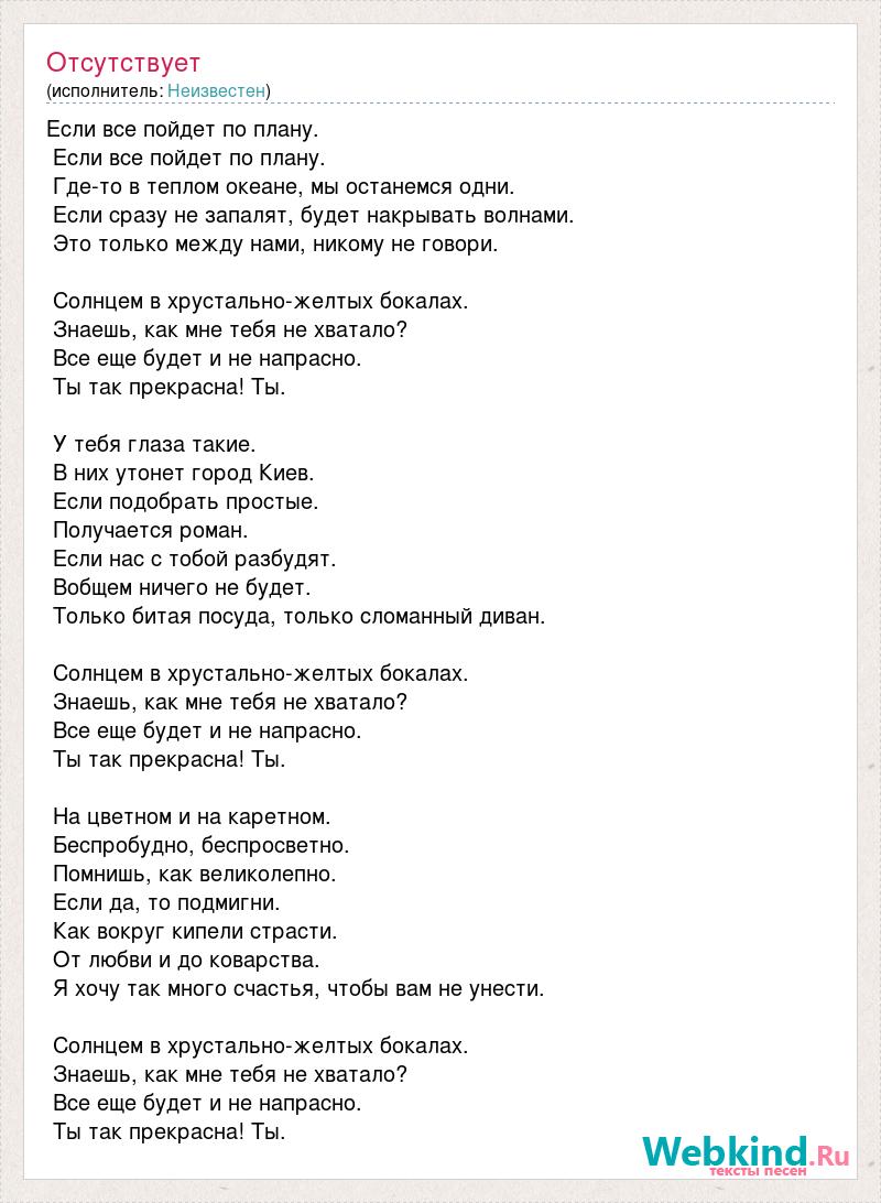 Если все пойдет по плану. Если все пойдет по плану. Где-то в теплом океане, мы останемся одни. Если сразу не запалят, будет накрывать волнами. Это только между нами, никому не говори. Солнцем в хрустально-желтых бокалах. Знаешь, как мне тебя не хватало? Все еще будет и не напрасно. Ты так прекрасна! Ты. У тебя глаза такие. В них утонет город Киев. Если подобрать простые. Получается роман. Если нас с тобой разбудят. Вобщем ничего не будет. Только битая посуда, только сломанный диван. Солнцем в хрустально-желтых бокалах. Знаешь, как мне тебя не хватало? Все еще будет и не напрасно. Ты так прекрасна! Ты. На цветном и на каретном. Беспробудно, беспросветно. Помнишь, как великолепно. Если да, то подмигни. Как вокруг кипели страсти. От любви и до коварства. Я хочу так много счастья, чтобы вам не унести. Солнцем в хрустально-желтых бокалах. Знаешь, как мне тебя не хватало? Все еще будет и не напрасно. Ты так прекрасна! Ты.