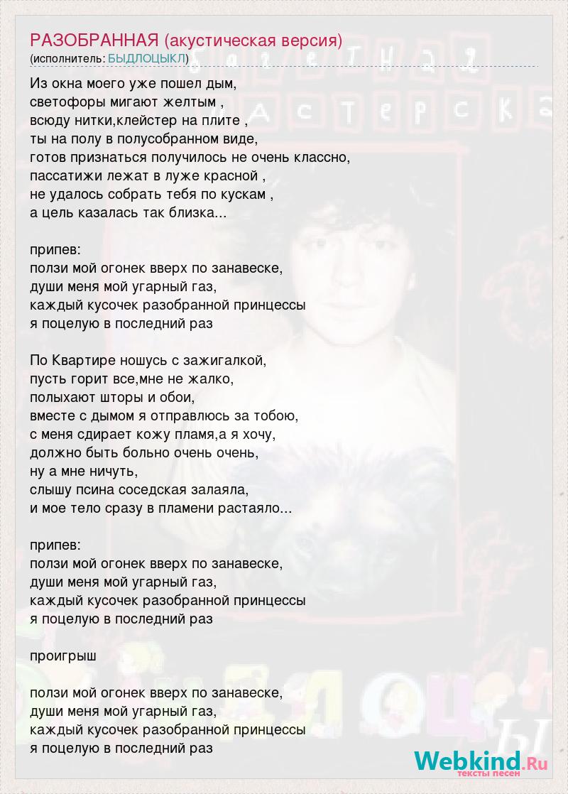 Из окна моего уже пошел дым, светофоры мигают желтым , всюду нитки,клейстер на плите , ты на полу в полусобранном виде, готов признаться получилось не очень классно, пассатижи лежат в луже красной , не удалось собрать тебя по кускам , а цель казалась так близка... припев: ползи мой огонек вверх по занавеске, души меня мой угарный газ, каждый кусочек разобранной принцессы я поцелую в последний раз По Квартире ношусь с зажигалкой, пусть горит все,мне не жалко, полыхают шторы и обои, вместе с дымом я отправлюсь за тобою, с меня сдирает кожу пламя,а я хочу, должно быть больно очень очень, ну а мне ничуть, слышу псина соседская залаяла, и мое тело сразу в пламени растаяло... припев: ползи мой огонек вверх по занавеске, души меня мой угарный газ, каждый кусочек разобранной принцессы я поцелую в последний раз проигрыш ползи мой огонек вверх по занавеске, души меня мой угарный газ, каждый кусочек разобранной принцессы я поцелую в последний раз