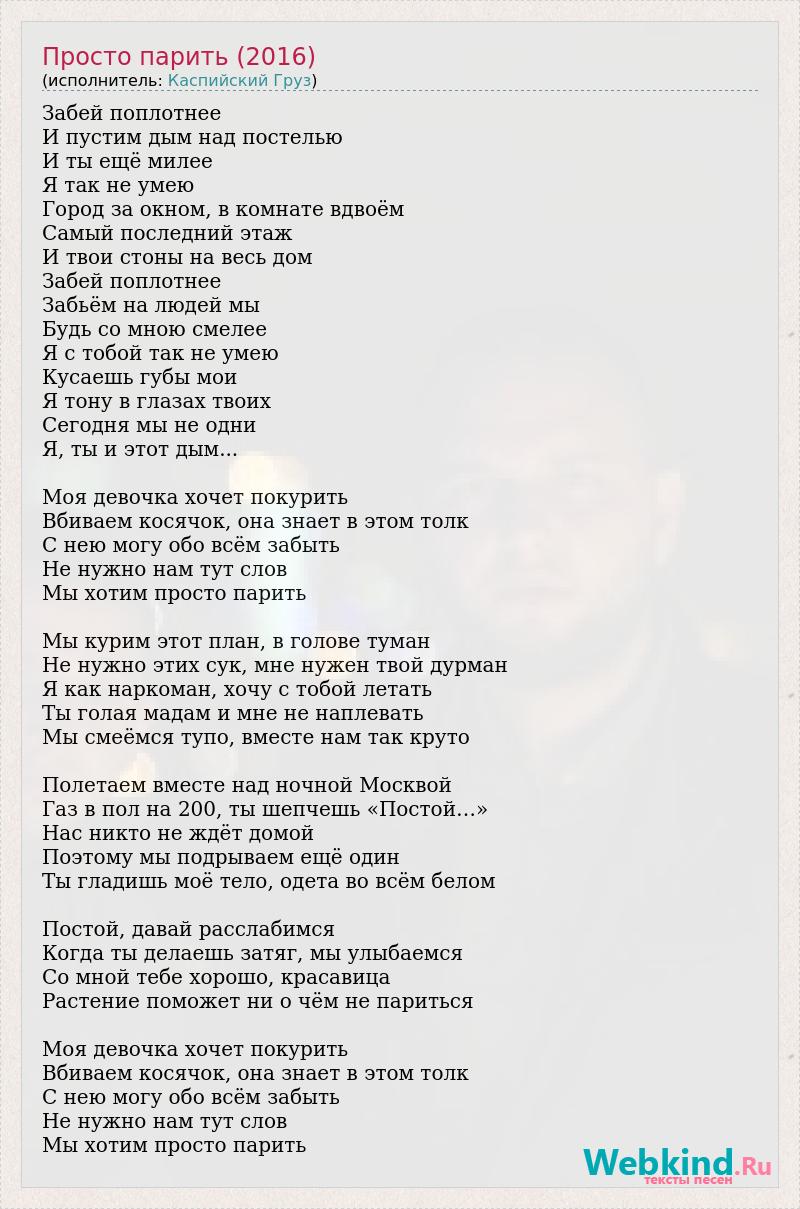 Забей поплотнее И пустим дым над постелью И ты ещё милее Я так не умею Город за окном, в комнате вдвоём Самый последний этаж И твои стоны на весь дом Забей поплотнее Забьём на людей мы Будь со мною смелее Я с тобой так не умею Кусаешь губы мои Я тону в глазах твоих Сегодня мы не одни Я, ты и этот дым... Моя девочка хочет покурить Вбиваем косячок, она знает в этом толк С нею могу обо всём забыть Не нужно нам тут слов Мы хотим просто парить Мы курим этот план, в голове туман Не нужно этих сук, мне нужен твой дурман Я как наркоман, хочу с тобой летать Ты голая мадам и мне не наплевать Мы смеёмся тупо, вместе нам так круто Полетаем вместе над ночной Москвой Газ в пол на 200, ты шепчешь «Постой…» Нас никто не ждёт домой Поэтому мы подрываем ещё один Ты гладишь моё тело, одета во всём белом Постой, давай расслабимся Когда ты делаешь затяг, мы улыбаемся Со мной тебе хорошо, красавица Растение поможет ни о чём не париться Моя девочка хочет покурить Вбиваем косячок, она знает в этом толк С нею могу обо всём забыть Не нужно нам тут слов Мы хотим просто парить