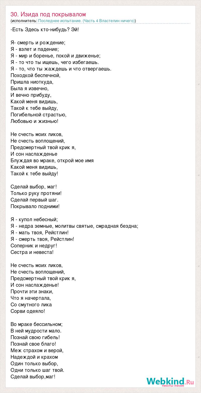 -Есть Здесь кто-нибудь? Эй! Я- смерть и рождение; Я - взлет и падение; Я - мир и боренье, покой и движенье; Я - то что ты ищешь, чего избегаешь. Я - то, что ты жаждешь и что отвергаешь. Походкой беспечной, Пришла ниоткуда, Была я извечно, И вечно прибуду, Какой меня видишь, Такой к тебе выйду, Погибельной страстью, Любовью и жизнью! Не счесть моих ликов, Не счесть воплощений, Предсмертный твой крик я, И сон наслажденье Блуждая во мраке, открой мое имя Какой меня видишь, Такой к тебе выйду! Сделай выбор, маг! Только руку протяни! Сделай первый шаг. Покрывало подними! Я - купол небесный; Я - недра земные, молитвы святые, смрадная бездна; Я - мать твоя, Рейстлин! Я - смерть твоя, Рейстлин! Соперник и недруг! Сестра и невеста! Не счесть моих ликов, Не счесть воплощений, Предсмертный твой крик я, И сон наслажденье! Прочти эти знаки, Что я начертала, Со смутного лика Сорви одеяло! Во мраке бессильном; В ней мудрости мало. Познай свою гибель! Познай свое благо! Меж страхом и верой, Надеждой и крахом Один только выбор, Одни только шаг твой. Сделай выбор,маг!