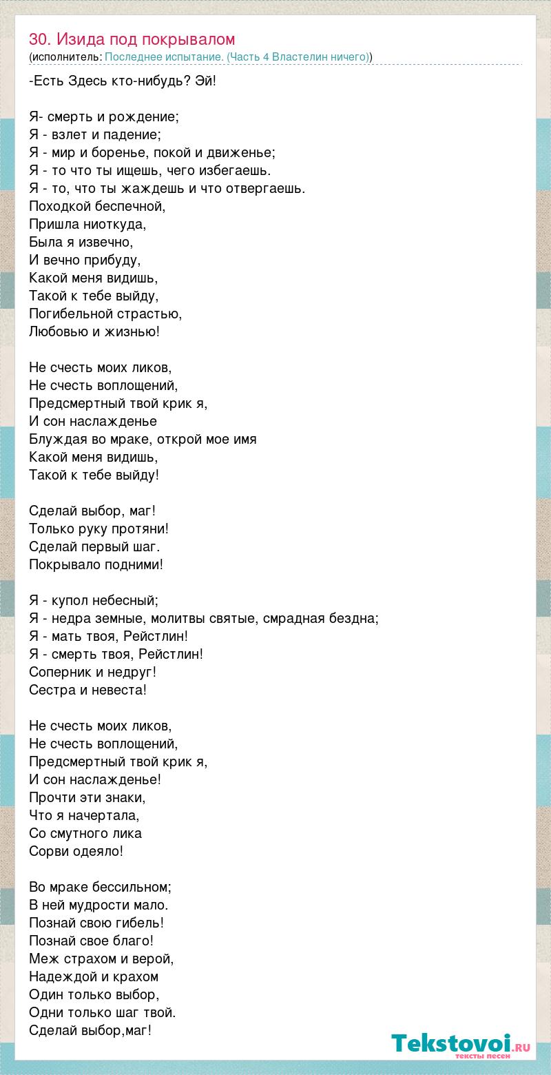 -Есть Здесь кто-нибудь? Эй! Я- смерть и рождение; Я - взлет и падение; Я - мир и боренье, покой и движенье; Я - то что ты ищешь, чего избегаешь. Я - то, что ты жаждешь и что отвергаешь. Походкой беспечной, Пришла ниоткуда, Была я извечно, И вечно прибуду, Какой меня видишь, Такой к тебе выйду, Погибельной страстью, Любовью и жизнью! Не счесть моих ликов, Не счесть воплощений, Предсмертный твой крик я, И сон наслажденье Блуждая во мраке, открой мое имя Какой меня видишь, Такой к тебе выйду! Сделай выбор, маг! Только руку протяни! Сделай первый шаг. Покрывало подними! Я - купол небесный; Я - недра земные, молитвы святые, смрадная бездна; Я - мать твоя, Рейстлин! Я - смерть твоя, Рейстлин! Соперник и недруг! Сестра и невеста! Не счесть моих ликов, Не счесть воплощений, Предсмертный твой крик я, И сон наслажденье! Прочти эти знаки, Что я начертала, Со смутного лика Сорви одеяло! Во мраке бессильном; В ней мудрости мало. Познай свою гибель! Познай свое благо! Меж страхом и верой, Надеждой и крахом Один только выбор, Одни только шаг твой. Сделай выбор,маг!