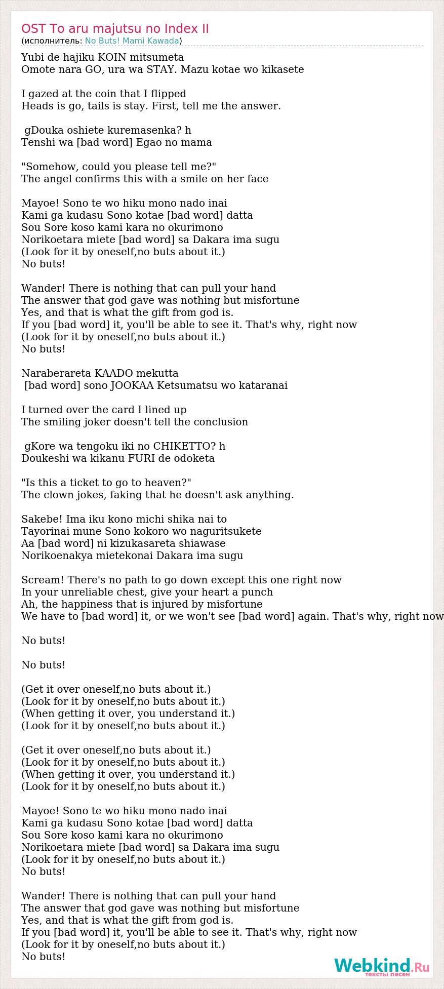 Yubi de hajiku KOIN mitsumeta Omote nara GO, ura wa STAY. Mazu kotae wo kikasete I gazed at the coin that I flipped Heads is go, tails is stay. First, tell me the answer. gDouka oshiete kuremasenka? h Tenshi wa [bad word] Egao no mama "Somehow, could you please tell me?" The angel confirms this with a smile on her face Mayoe! Sono te wo hiku mono nado inai Kami ga kudasu Sono kotae [bad word] datta Sou Sore koso kami kara no okurimono Norikoetara miete [bad word] sa Dakara ima sugu (Look for it by oneself,no buts about it.) No buts! Wander! There is nothing that can pull your hand The answer that god gave was nothing but misfortune Yes, and that is what the gift from god is. If you [bad word] it, you'll be able to see it. That's why, right now (Look for it by oneself,no buts about it.) No buts! Naraberareta KAADO mekutta [bad word] sono JOOKAA Ketsumatsu wo kataranai I turned over the card I lined up The smiling joker doesn't tell the conclusion gKore wa tengoku iki no CHIKETTO? h Doukeshi wa kikanu FURI de odoketa "Is this a ticket to go to heaven?" The clown jokes, faking that he doesn't ask anything. Sakebe! Ima iku kono michi shika nai to Tayorinai mune Sono kokoro wo naguritsukete Aa [bad word] ni kizukasareta shiawase Norikoenakya mietekonai Dakara ima sugu Scream! There's no path to go down except this one right now In your unreliable chest, give your heart a punch Ah, the happiness that is injured by misfortune We have to [bad word] it, or we won't see [bad word] again. That's why, right now No buts! No buts! (Get it over oneself,no buts about it.) (Look for it by oneself,no buts about it.) (When getting it over, you understand it.) (Look for it by oneself,no buts about it.) (Get it over oneself,no buts about it.) (Look for it by oneself,no buts about it.) (When getting it over, you understand it.) (Look for it by oneself,no buts about it.) Mayoe! Sono te wo hiku mono nado inai Kami ga kudasu Sono kotae [bad word] datta Sou Sore koso kami kara no okurimono Norikoetara miete [bad word] sa Dakara ima sugu (Look for it by oneself,no buts about it.) No buts! Wander! There is nothing that can pull your hand The answer that god gave was nothing but misfortune Yes, and that is what the gift from god is. If you [bad word] it, you'll be able to see it. That's why, right now (Look for it by oneself,no buts about it.) No buts!