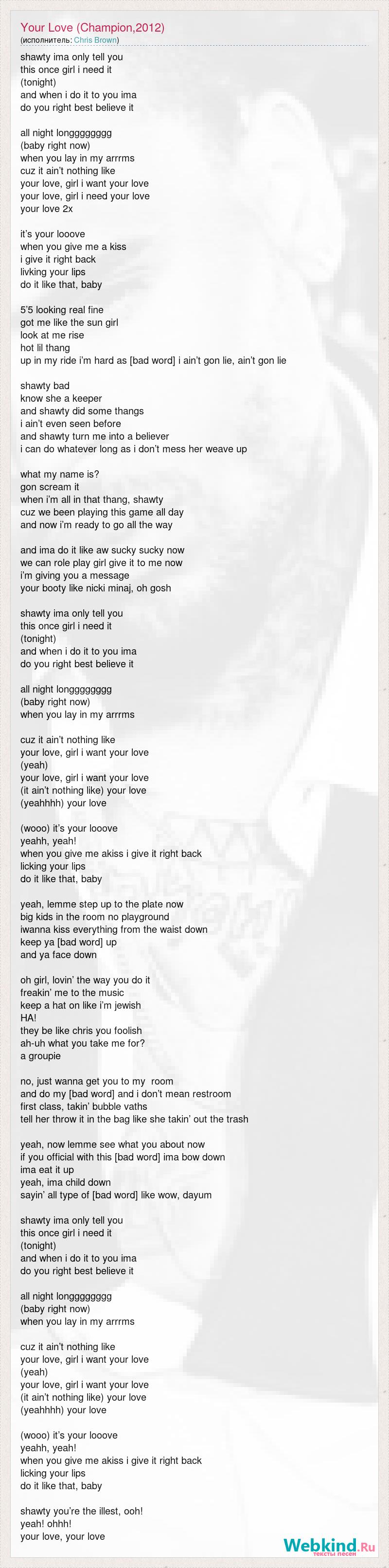 shawty ima only tell you this once girl i need it (tonight) and when i do it to you ima do you right best believe it all night longggggggg (baby right now) when you lay in my arrrms cuz it ain’t nothing like your love, girl i want your love your love, girl i need your love your love 2x it’s your looove when you give me a kiss i give it right back livking your lips do it like that, baby 5’5 looking real fine got me like the sun girl look at me rise hot lil thang up in my ride i’m hard as [bad word] i ain’t gon lie, ain’t gon lie shawty bad know she a keeper and shawty did some thangs i ain’t even seen before and shawty turn me into a believer i can do whatever long as i don’t mess her weave up what my name is? gon scream it when i’m all in that thang, shawty cuz we been playing this game all day and now i’m ready to go all the way and ima do it like aw sucky sucky now we can role play girl give it to me now i’m giving you a message your booty like nicki minaj, oh gosh shawty ima only tell you this once girl i need it (tonight) and when i do it to you ima do you right best believe it all night longggggggg (baby right now) when you lay in my arrrms cuz it ain’t nothing like your love, girl i want your love (yeah) your love, girl i want your love (it ain’t nothing like) your love (yeahhhh) your love (wooo) it’s your looove yeahh, yeah! when you give me akiss i give it right back licking your lips do it like that, baby yeah, lemme step up to the plate now big kids in the room no playground iwanna kiss everything from the waist down keep ya [bad word] up and ya face down oh girl, lovin’ the way you do it freakin’ me to the music keep a hat on like i’m jewish HA! they be like chris you foolish ah-uh what you take me for? a groupie no, just wanna get you to my room and do my [bad word] and i don’t mean restroom first class, takin’ bubble vaths tell her throw it in the bag like she takin’ out the trash yeah, now lemme see what you about now if you official with this [bad word] ima bow down ima eat it up yeah, ima child down sayin’ all type of [bad word] like wow, dayum shawty ima only tell you this once girl i need it (tonight) and when i do it to you ima do you right best believe it all night longggggggg (baby right now) when you lay in my arrrms cuz it ain’t nothing like your love, girl i want your love (yeah) your love, girl i want your love (it ain’t nothing like) your love (yeahhhh) your love (wooo) it’s your looove yeahh, yeah! when you give me akiss i give it right back licking your lips do it like that, baby shawty you’re the illest, ooh! yeah! ohhh! your love, your love
