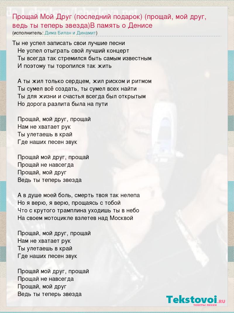 Главная→Исполнители→Дима Билан И Динамит→Прощай Мой Друг (последний подарок) (прощай, мой друг, ведь ты теперь звезда)В