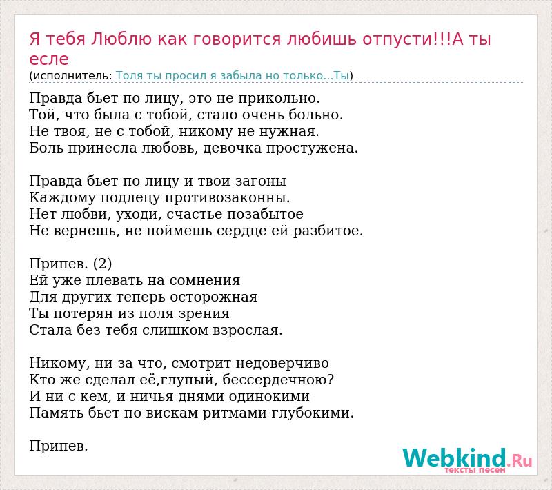 А как ты думаешь, о чем песня "Я тебя Люблю как говорится любишь отпусти!!!А ты есле" ?