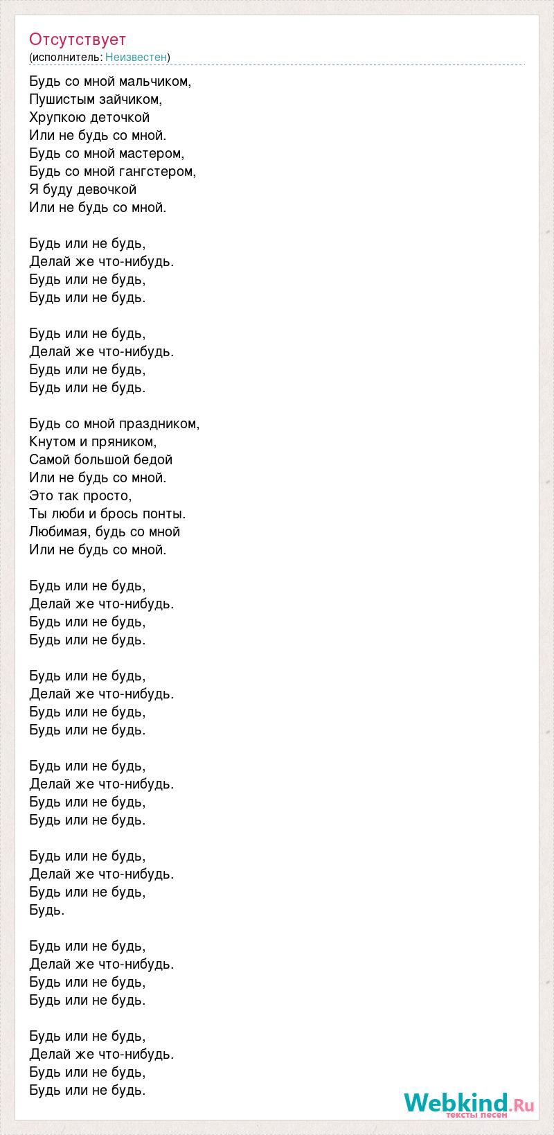 Будь со мной мальчиком, Пушистым зайчиком, Хрупкою деточкой Или не будь со мной. Будь со мной мастером, Будь со мной гангстером, Я буду девочкой Или не будь со мной. Будь или не будь, Делай же что-нибудь. Будь или не будь, Будь или не будь. Будь или не будь, Делай же что-нибудь. Будь или не будь, Будь или не будь. Будь со мной праздником, Кнутом и пряником, Самой большой бедой Или не будь со мной. Это так просто, Ты люби и брось понты. Любимая, будь со мной Или не будь со мной. Будь или не будь, Делай же что-нибудь. Будь или не будь, Будь или не будь. Будь или не будь, Делай же что-нибудь. Будь или не будь, Будь или не будь. Будь или не будь, Делай же что-нибудь. Будь или не будь, Будь или не будь. Будь или не будь, Делай же что-нибудь. Будь или не будь, Будь. Будь или не будь, Делай же что-нибудь. Будь или не будь, Будь или не будь. Будь или не будь, Делай же что-нибудь. Будь или не будь, Будь или не будь.