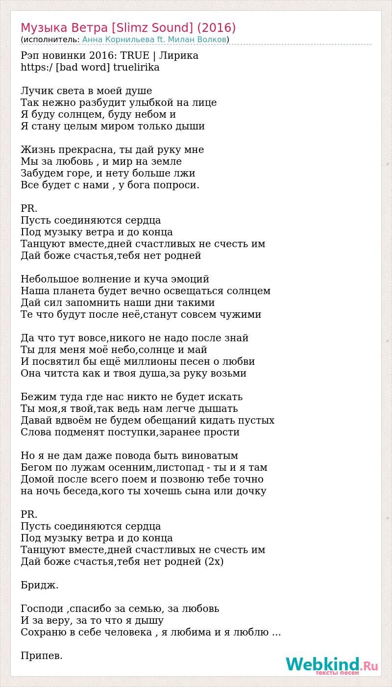 Рэп новинки 2016: TRUE | Лирика https:/ [bad word] truelirika Лучик света в моей душе Так нежно разбудит улыбкой на лице Я буду солнцем, буду небом и Я стану целым миром только дыши Жизнь прекрасна, ты дай руку мне Мы за любовь , и мир на земле Забудем горе, и нету больше лжи Все будет с нами , у бога попроси. PR. Пусть соединяются сердца Под музыку ветра и до конца Танцуют вместе,дней счастливых не счесть им Дай боже счастья,тебя нет родней Небольшое волнение и куча эмоций Наша планета будет вечно освещаться солнцем Дай сил запомнить наши дни такими Те что будут после неё,станут совсем чужими Да что тут вовсе,никого не надо после знай Ты для меня моё небо,солнце и май И посвятил бы ещё миллионы песен о любви Она читста как и твоя душа,за руку возьми Бежим туда где нас никто не будет искать Ты моя,я твой,так ведь нам легче дышать Давай вдвоём не будем обещаний кидать пустых Слова подменят поступки,заранее прости Но я не дам даже повода быть виноватым Бегом по лужам осенним,листопад - ты и я там Домой после всего поем и позвоню тебе точно на ночь беседа,кого ты хочешь сына или дочку PR. Пусть соединяются сердца Под музыку ветра и до конца Танцуют вместе,дней счастливых не счесть им Дай боже счастья,тебя нет родней (2х) Бридж. Господи ,спасибо за семью, за любовь И за веру, за то что я дышу Сохраню в себе человека , я любима и я люблю ... Припев.