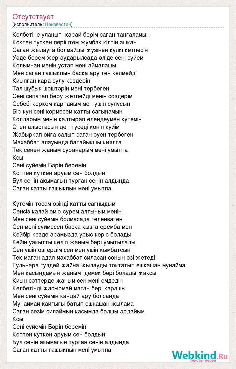 Келбетіне уланып карай берім саган тангаламын Коктен тускен періштем жумбак кілтін ашкан Саган жылауга болмайды жузінен кулкі кетпесін Уәде берем жер аударылсада әліде сені суйем Колымнан менін устап мені аймалашы Мен саган гашыкпын баска ару тен келмейді Киылган кара сулу коздерін Тал шубык шәштәрін мені тербеген Сені сипатап беру жетпейді менін создерім Себебі коркем карпайым мен ушін сулусын Бір кун сені кормесем катты сагынамын Колдарым менін калтырап елендеумен кутемін Әтен алыстасын деп туседі коніл куйім Жабыркап ойга салып саган әуен тербеген Махаббат алауында батайыкшы киялга Тек сенен жаным суранарым мені умытпа Ксы Сені суйемін Бәрін беремін Коптен куткен аруым сен болдын Бул сенін акымагын турган сенін алдында Саган катты гашыкпын мені умытпа Кутемін тосам озінді катты сагныдым Сенсіз калай омір сурем алтыным менін Мен сені суйемін болмасада геленваген Сен мені суймесен баска кызга еремба мен Кейбір кезде арамызда урыс керіс болады Кейін уакытты келіп жаным бәрі умытылады Сен ушін озгердім сен мен ушін кымбатсын Тек маган адал махаббат силасан сонын озі жетеді Гульнара гулдей жайна жылауды токтатып ешкашан мунайма Мен касындамын жаным демек бәрі болады жаксы Киын сәттерде жаным сен мені емдедін Келбетінді жасырмай маган бері карашы Мен сені суйемін кандай ару болсанда Мунаймай кайгыгы батып ешкашан жылама Саган сезім силаймын касымда болшы әрдайым Ксы Сені суйемін Бәрін беремін Коптен куткен аруым сен болдын Бул сенін акымагын турган сенін алдында Саган катты гашыкпын мені умытпа