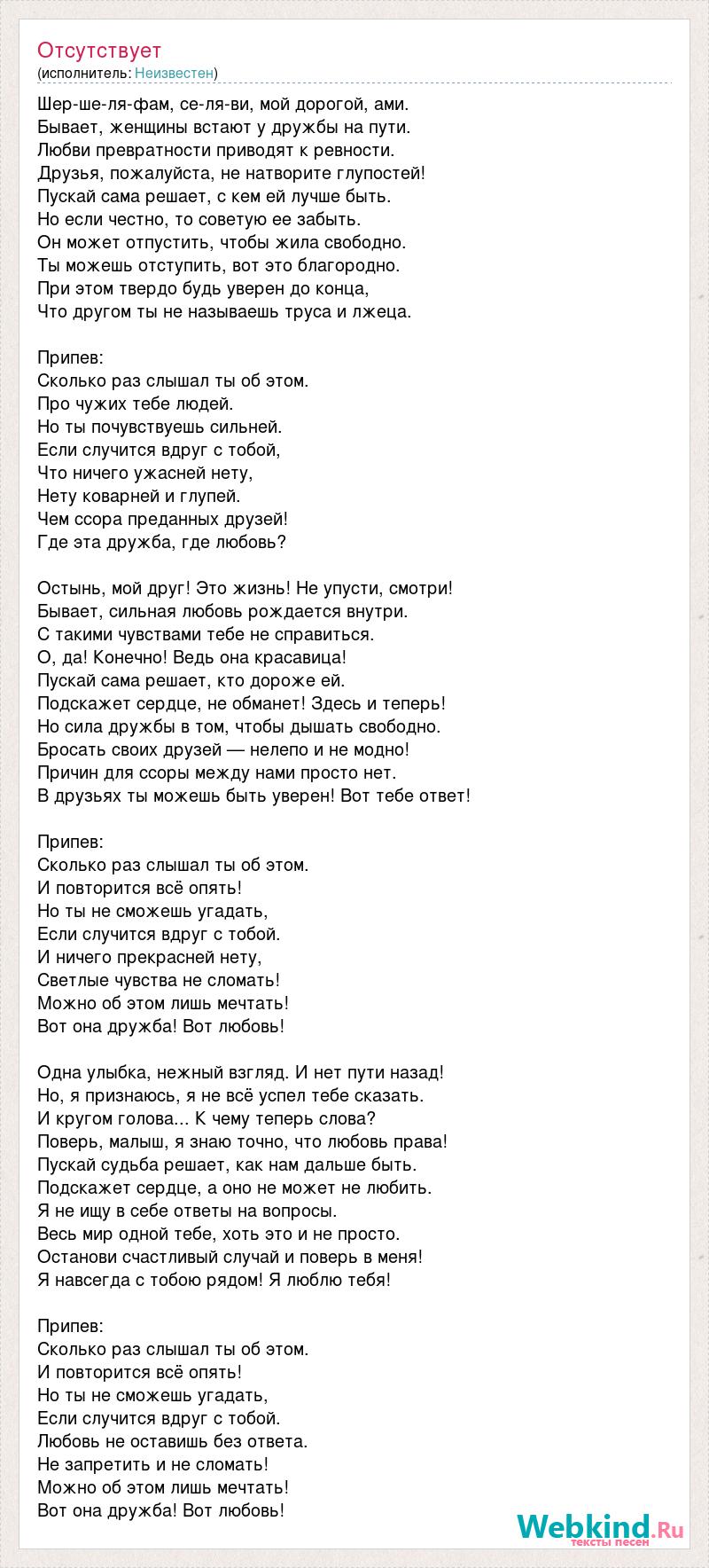 Шер-ше-ля-фам, се-ля-ви, мой дорогой, ами. Бывает, женщины встают у дружбы на пути. Любви превратности приводят к ревности. Друзья, пожалуйста, не натворите глупостей! Пускай сама решает, с кем ей лучше быть. Но если честно, то советую ее забыть. Он может отпустить, чтобы жила свободно. Ты можешь отступить, вот это благородно. При этом твердо будь уверен до конца, Что другом ты не называешь труса и лжеца. Припев: Сколько раз слышал ты об этом. Про чужих тебе людей. Но ты почувствуешь сильней. Если случится вдруг с тобой, Что ничего ужасней нету, Нету коварней и глупей. Чем ссора преданных друзей! Где эта дружба, где любовь? Остынь, мой друг! Это жизнь! Не упусти, смотри! Бывает, сильная любовь рождается внутри. С такими чувствами тебе не справиться. О, да! Конечно! Ведь она красавица! Пускай сама решает, кто дороже ей. Подскажет сердце, не обманет! Здесь и теперь! Но сила дружбы в том, чтобы дышать свободно. Бросать своих друзей — нелепо и не модно! Причин для ссоры между нами просто нет. В друзьях ты можешь быть уверен! Вот тебе ответ! Припев: Сколько раз слышал ты об этом. И повторится всё опять! Но ты не сможешь угадать, Если случится вдруг с тобой. И ничего прекрасней нету, Светлые чувства не сломать! Можно об этом лишь мечтать! Вот она дружба! Вот любовь! Одна улыбка, нежный взгляд. И нет пути назад! Но, я признаюсь, я не всё успел тебе сказать. И кругом голова... К чему теперь слова? Поверь, малыш, я знаю точно, что любовь права! Пускай судьба решает, как нам дальше быть. Подскажет сердце, а оно не может не любить. Я не ищу в себе ответы на вопросы. Весь мир одной тебе, хоть это и не просто. Останови счастливый случай и поверь в меня! Я навсегда с тобою рядом! Я люблю тебя! Припев: Сколько раз слышал ты об этом. И повторится всё опять! Но ты не сможешь угадать, Если случится вдруг с тобой. Любовь не оставишь без ответа. Не запретить и не сломать! Можно об этом лишь мечтать! Вот она дружба! Вот любовь!