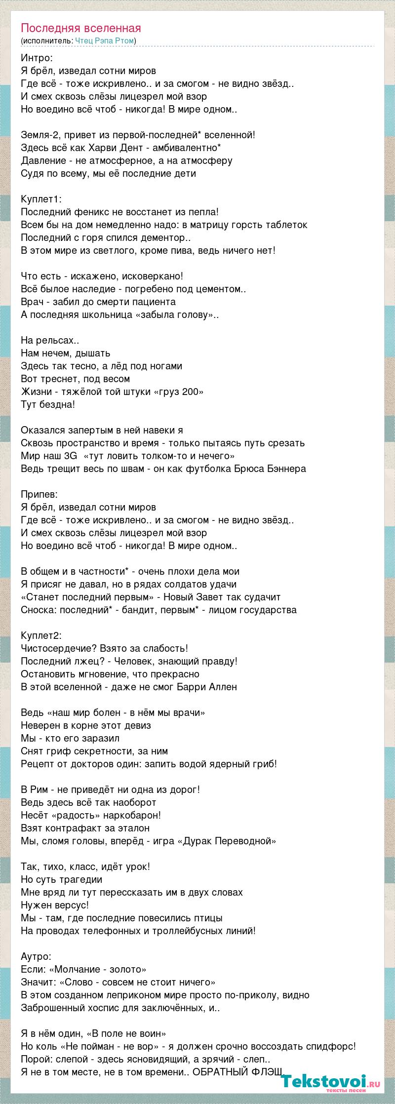 Интро: Я брёл, изведал сотни миров Где всё - тоже искривлено.. и за смогом - не видно звёзд.. И смех сквозь слёзы лицезрел мой взор Но воедино всё чтоб - никогда! В мире одном.. Земля-2, привет из первой-последней* вселенной! Здесь всё как Харви Дент - амбивалентно* Давление - не атмосферное, а на атмосферу Судя по всему, мы её последние дети Куплет1: Последний феникс не восстанет из пепла! Всем бы на дом немедленно надо: в матрицу горсть таблеток Последний с горя спился дементор.. В этом мире из светлого, кроме пива, ведь ничего нет! Что есть - искажено, исковеркано! Всё былое наследие - погребено под цементом.. Врач - забил до смерти пациента А последняя школьница «забыла голову».. На рельсах.. Нам нечем, дышать Здесь так тесно, а лёд под ногами Вот треснет, под весом Жизни - тяжёлой той штуки «груз 200» Тут бездна! Оказался запертым в ней навеки я Сквозь пространство и время - только пытаясь путь срезать Мир наш 3G «тут ловить толком-то и нечего» Ведь трещит весь по швам - он как футболка Брюса Бэннера Припев: Я брёл, изведал сотни миров Где всё - тоже искривлено.. и за смогом - не видно звёзд.. И смех сквозь слёзы лицезрел мой взор Но воедино всё чтоб - никогда! В мире одном.. В общем и в частности* - очень плохи дела мои Я присяг не давал, но в рядах солдатов удачи «Станет последний первым» - Новый Завет так судачит Сноска: последний* - бандит, первым* - лицом государства Куплет2: Чистосердечие? Взято за слабость! Последний лжец? - Человек, знающий правду! Остановить мгновение, что прекрасно В этой вселенной - даже не смог Барри Аллен Ведь «наш мир болен - в нём мы врачи» Неверен в корне этот девиз Мы - кто его заразил Снят гриф секретности, за ним Рецепт от докторов один: запить водой ядерный гриб! В Рим - не приведёт ни одна из дорог! Ведь здесь всё так наоборот Несёт «радость» наркобарон! Взят контрафакт за эталон Мы, сломя головы, вперёд - игра «Дурак Переводной» Так, тихо, класс, идёт урок! Но суть трагедии Мне вряд ли тут перессказать им в двух словах Нужен версус! Мы - там, где последние повесились птицы На проводах телефонных и троллейбусных линий! Аутро: Если: «Молчание - золото» Значит: «Слово - совсем не стоит ничего» В этом созданном леприконом мире просто по-приколу, видно Заброшенный хоспис для заключённых, и.. Я в нём один, «В поле не воин» Но коль «Не пойман - не вор» - я должен срочно воссоздать спидфорс! Порой: слепой - здесь ясновидящий, а зрячий - слеп.. Я не в том месте, не в том времени.. ОБРАТНЫЙ ФЛЭШ.