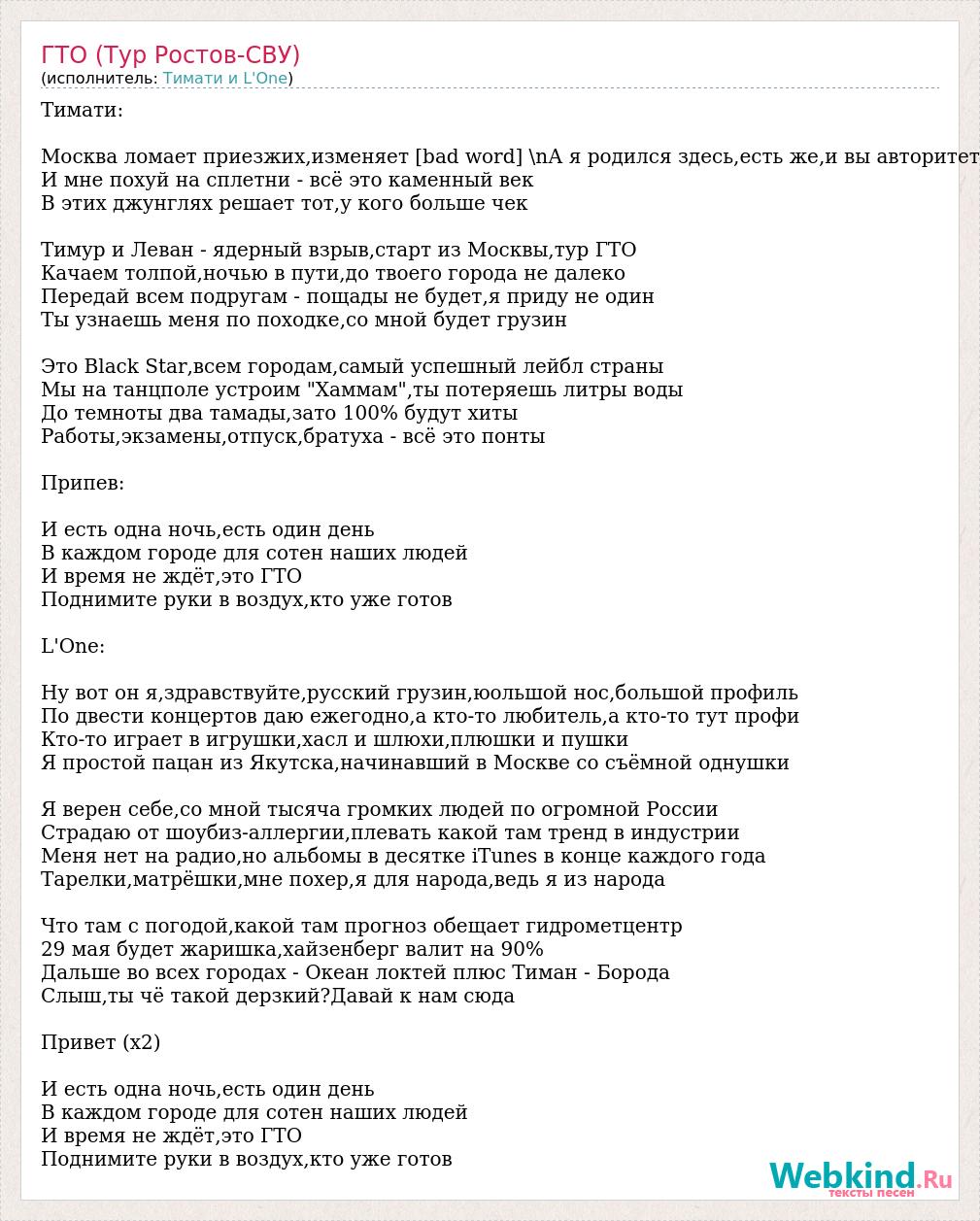 Тимати: Москва ломает приезжих,изменяет [bad word] \nА я родился здесь,есть же,и вы авторитет И мне похуй на сплетни - всё это каменный век В этих джунглях решает тот,у кого больше чек Тимур и Леван - ядерный взрыв,старт из Москвы,тур ГТО Качаем толпой,ночью в пути,до твоего города не далеко Передай всем подругам - пощады не будет,я приду не один Ты узнаешь меня по походке,со мной будет грузин Это Black Star,всем городам,самый успешный лейбл страны Мы на танцполе устроим "Хаммам",ты потеряешь литры воды До темноты два тамады,зато 100% будут хиты Работы,экзамены,отпуск,братуха - всё это понты Припев: И есть одна ночь,есть один день В каждом городе для сотен наших людей И время не ждёт,это ГТО Поднимите руки в воздух,кто уже готов L'One: Ну вот он я,здравствуйте,русский грузин,юольшой нос,большой профиль По двести концертов даю ежегодно,а кто-то любитель,а кто-то тут профи Кто-то играет в игрушки,хасл и шлюхи,плюшки и пушки Я простой пацан из Якутска,начинавший в Москве со съёмной однушки Я верен себе,со мной тысяча громких людей по огромной России Страдаю от шоубиз-аллергии,плевать какой там тренд в индустрии Меня нет на радио,но альбомы в десятке iTunes в конце каждого года Тарелки,матрёшки,мне похер,я для народа,ведь я из народа Что там с погодой,какой там прогноз обещает гидрометцентр 29 мая будет жаришка,хайзенберг валит на 90% Дальше во всех городах - Океан локтей плюс Тиман - Борода Слыш,ты чё такой дерзкий?Давай к нам сюда Привет (х2) И есть одна ночь,есть один день В каждом городе для сотен наших людей И время не ждёт,это ГТО Поднимите руки в воздух,кто уже готов