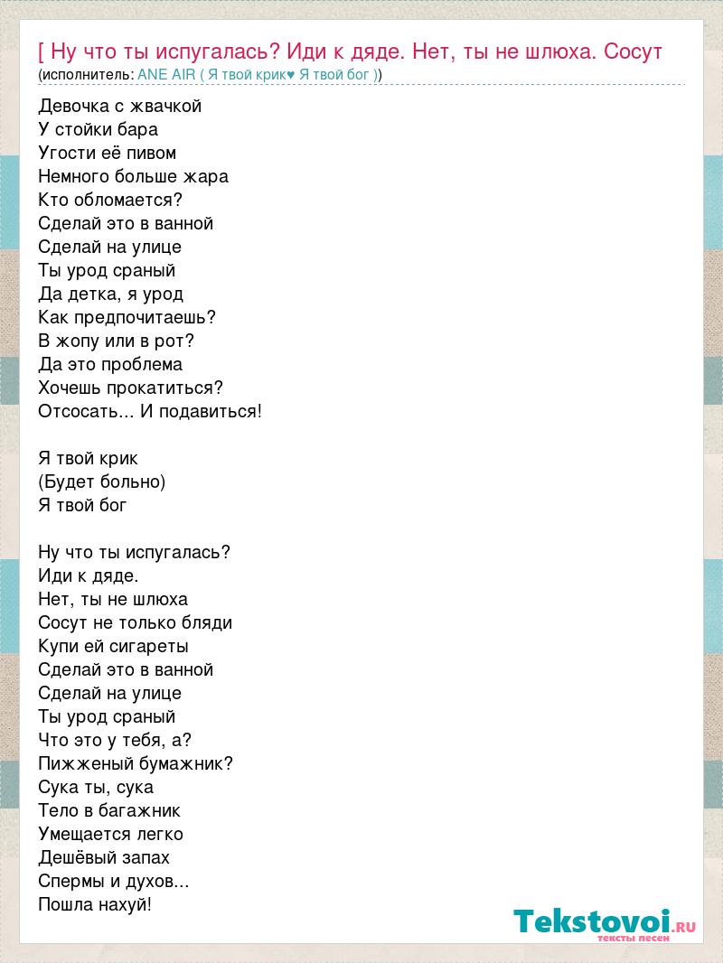 Девочка с жвачкой У стойки бара Угости её пивом Немного больше жара Кто обломается? Сделай это в ванной Сделай на улице Ты урод сраный Да детка, я урод Как предпочитаешь? В жопу или в рот? Да это проблема Хочешь прокатиться? Отсосать... И подавиться! Я твой крик (Будет больно) Я твой бог Ну что ты испугалась? Иди к дяде. Нет, ты не шлюха Сосут не только бляди Купи ей сигареты Сделай это в ванной Сделай на улице Ты урод сраный Что это у тебя, а? Пижженый бумажник? Сука ты, сука Тело в багажник Умещается легко Дешёвый запах Спермы и духов... Пошла нахуй!